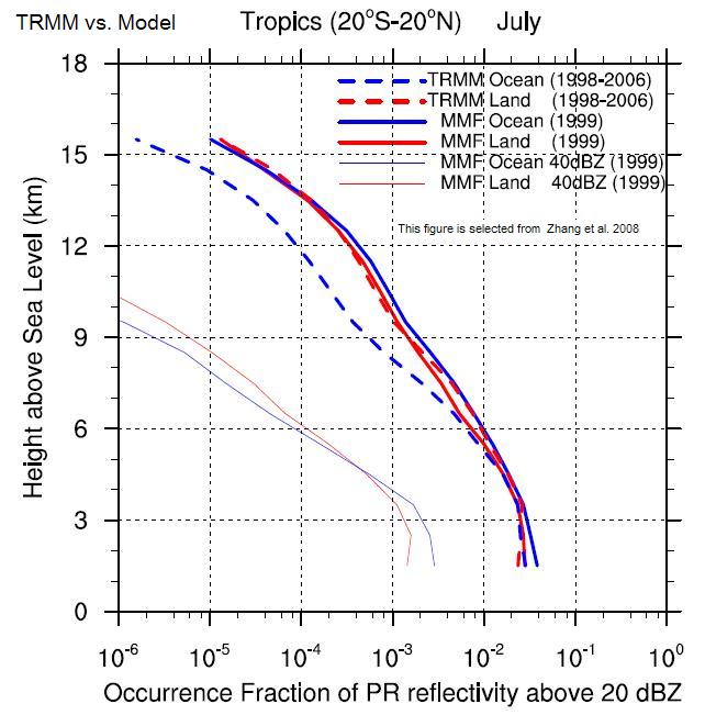 The amount of rainfall reaching ground is what affects people directly. Why do we care about the precipitation at other heights? ?One reason is that the vertical structure of a convective system contains important information about its physical processes, and also about its potential for severe weather.? For example, only very intense updrafts can produce and loft large ice particles high into the storm, an indicator of hail or other severe weather.? The presence of precipitation particles at different altitude levels is directly related to latent heat release, which in turn has direct impact on the general circulation of the atmpsphere. Thus, it is important for climate models to correctly simulate the fractional occurrence of the precipitation as a function of height. One recent study suggests that a cloud resolving model embedded in a general circulation model overestimates the precipitation over tropical oceans in the upper troposphere (left figure, Zhang et al. 2008). Besides model validation, the large ice particles at high altitudes are likely associated with strong updrafts and lightning, which have a direct relation to aviation safety.
