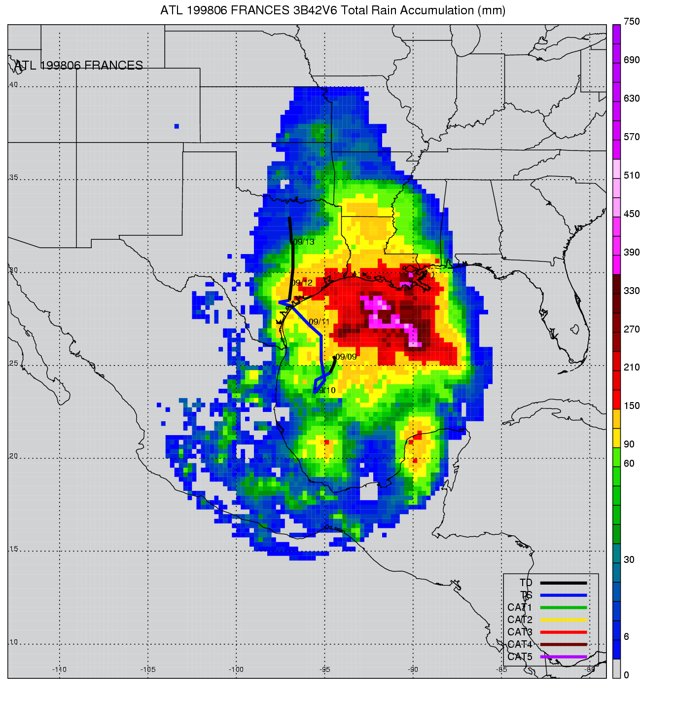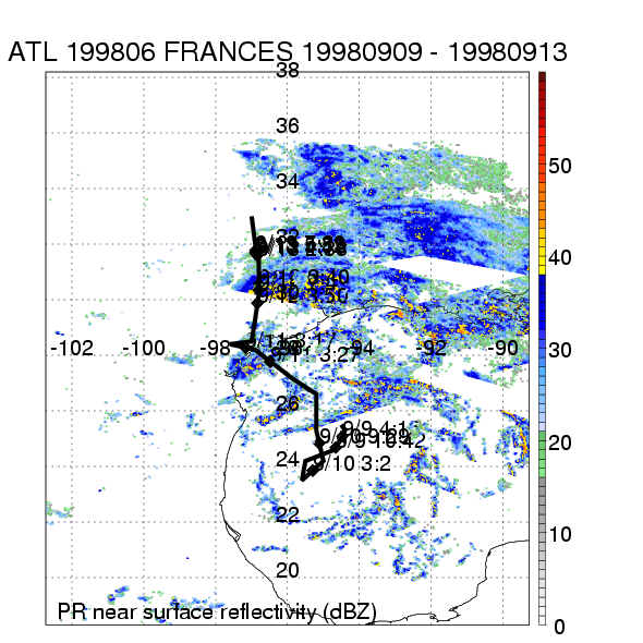 | 6 | 199806 | FRANCES | 19980909 - 19980913 | 990 | 55 | 13 | 112 | snapshots | rain accumulation |