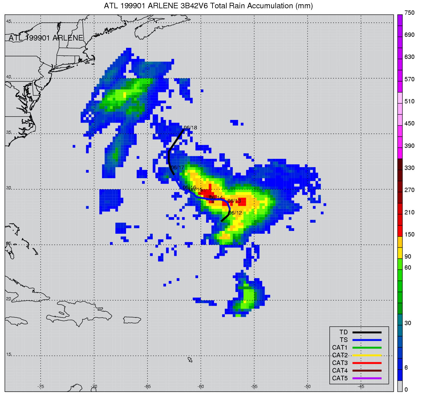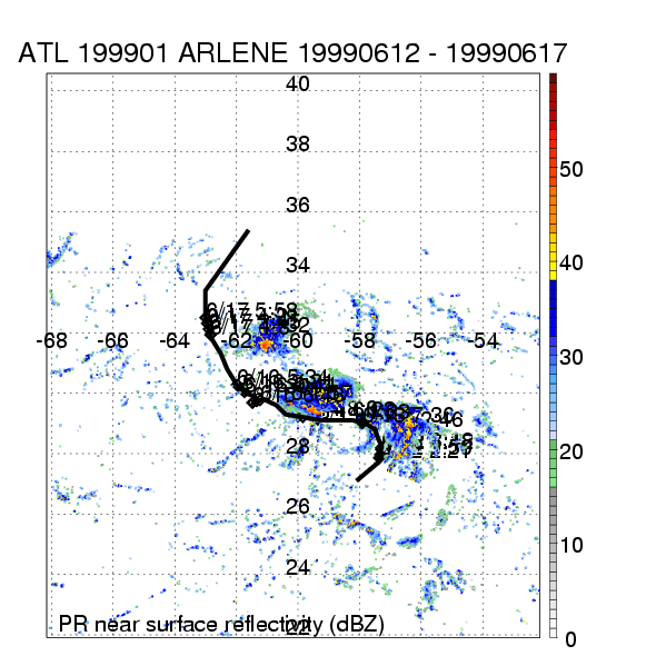 | 1 | 199901 | ARLENE | 19990612 - 19990617 | 1006 | 50 | 18 | 88 | snapshots | rain accumulation |