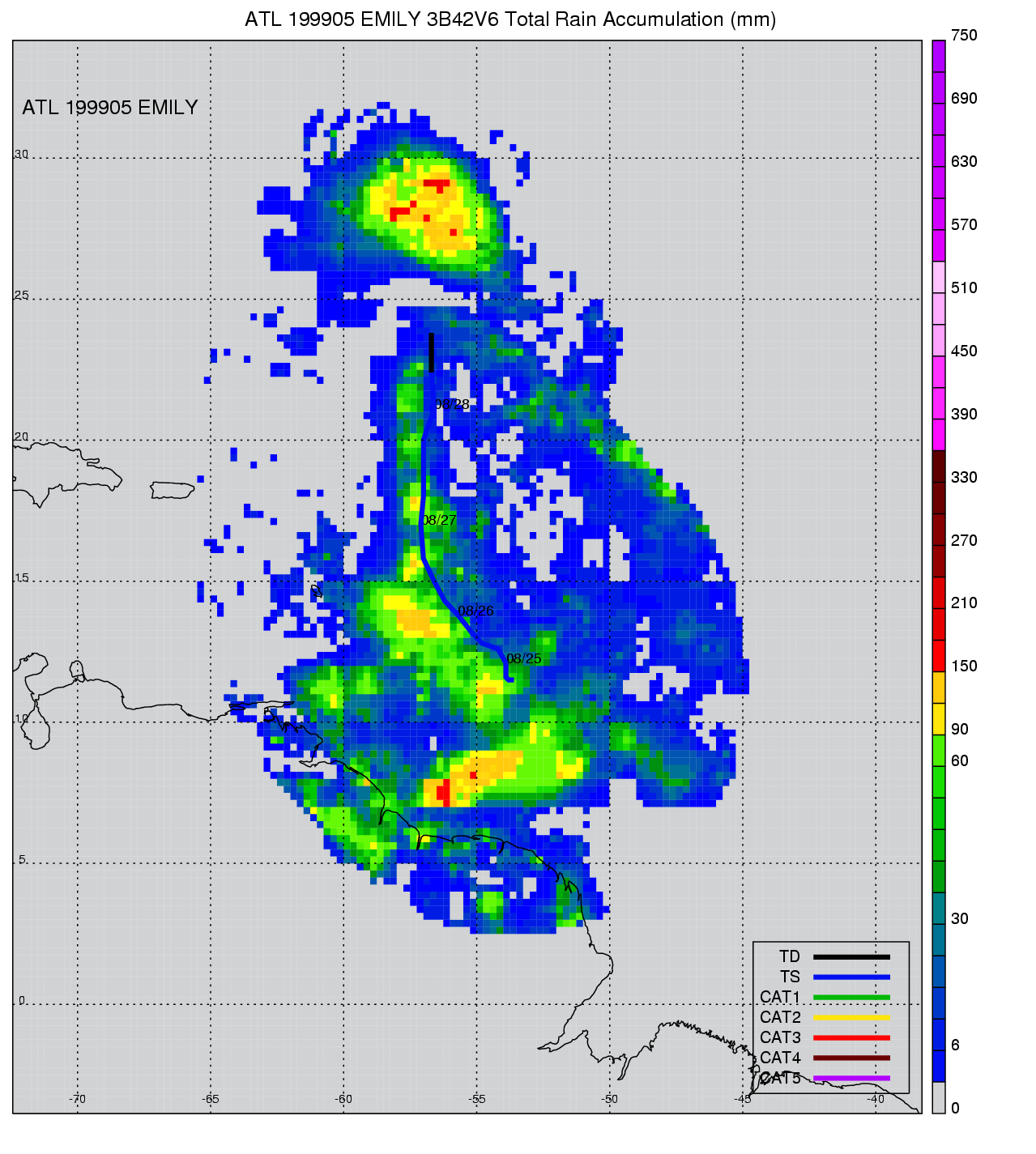| 5 | 199905 | EMILY | 19990825 - 19990828 | 1004 | 45 | 6 | 46 | snapshots | rain accumulation |
