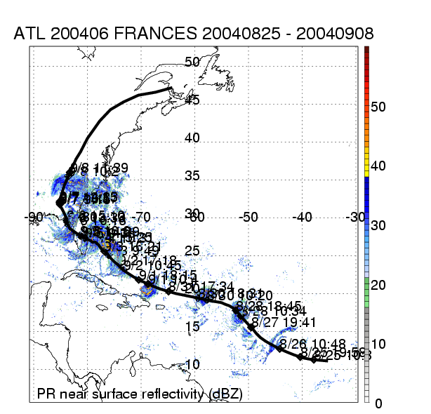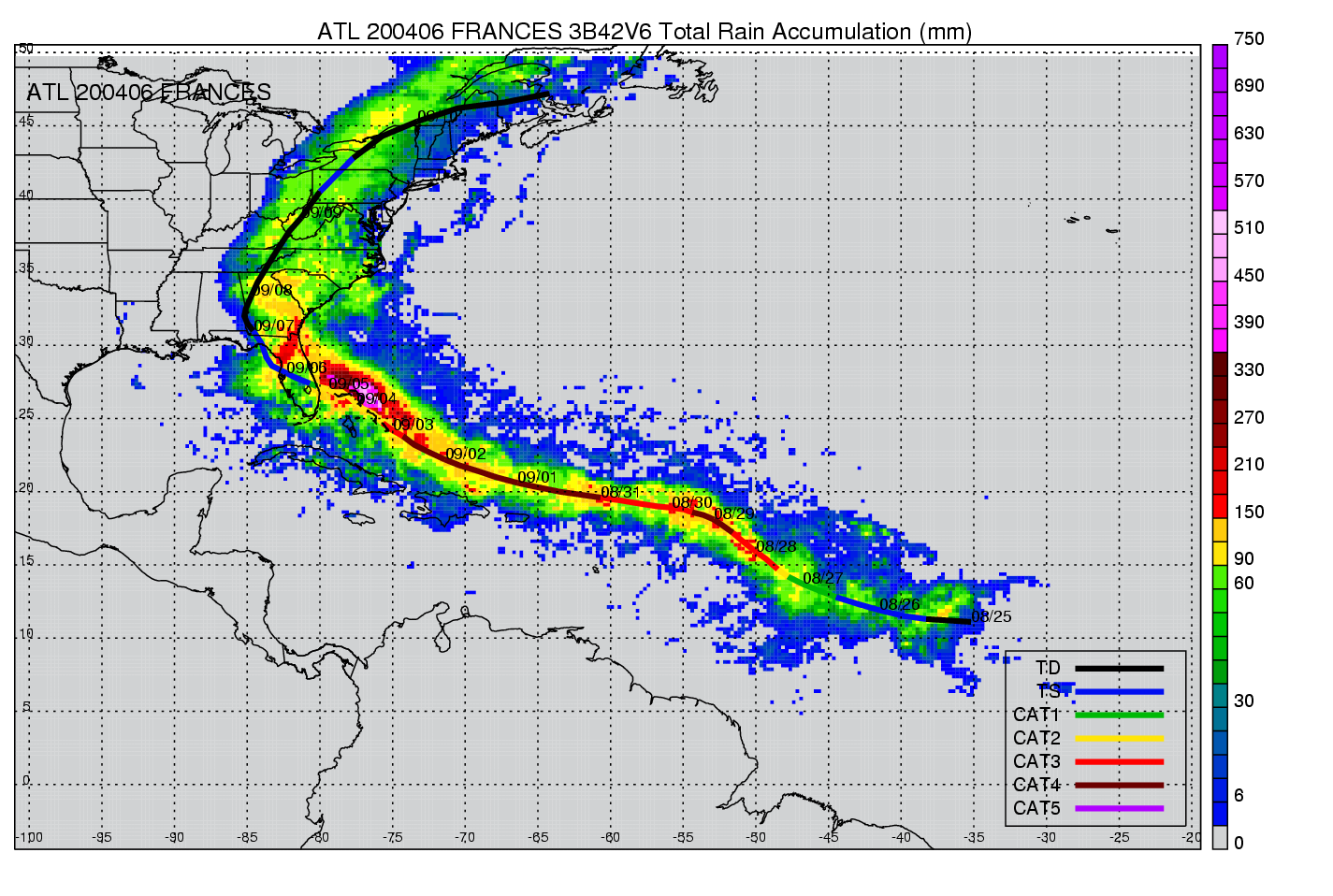| 6 | 200406 | FRANCES | 20040825 - 20040908 | 937 | 125 | 30 | 213 | snapshots | rain accumulation |