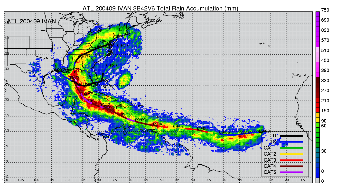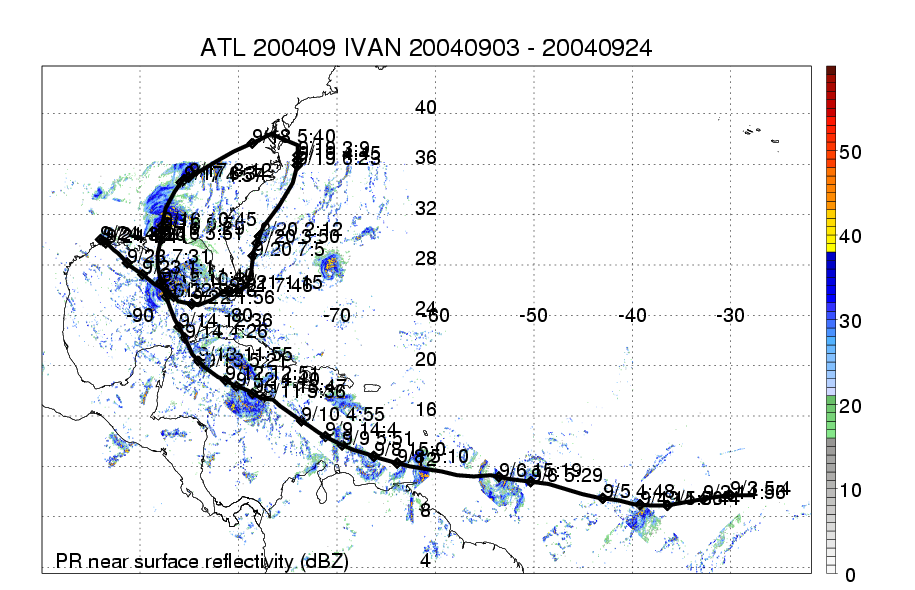 | 9 | 200409 | IVAN | 20040903 - 20040924 | 910 | 145 | 49 | 362 | snapshots | rain accumulation |