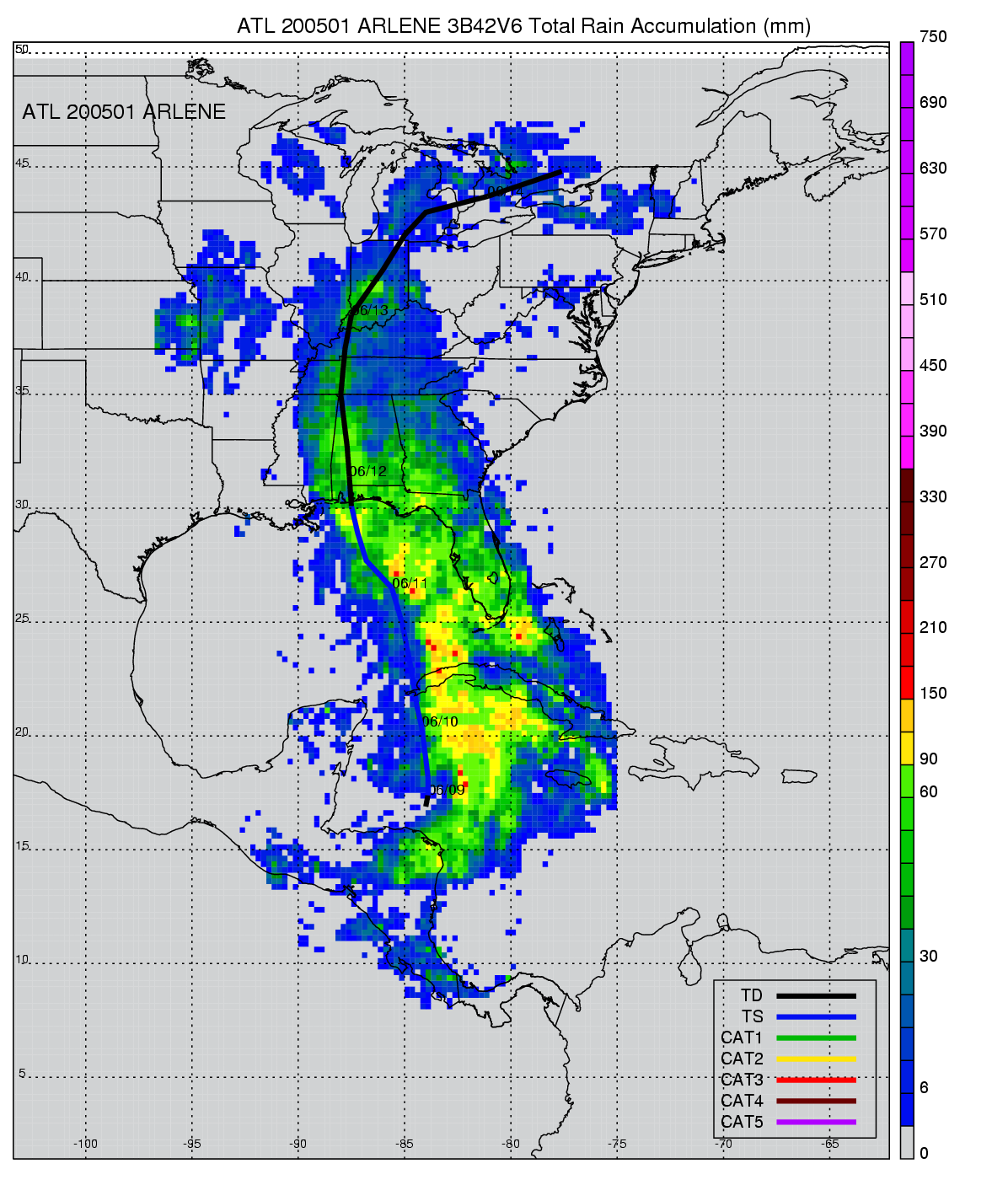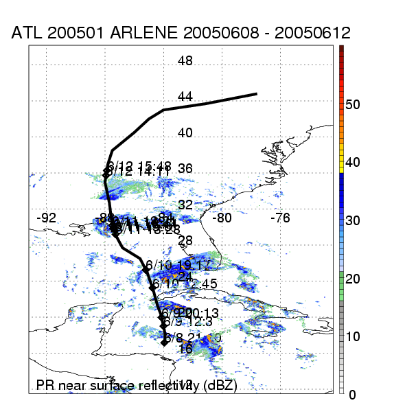 | 1 | 200501 | ARLENE | 20050608 - 20050612 | 990 | 60 | 11 | 113 | snapshots | rain accumulation |