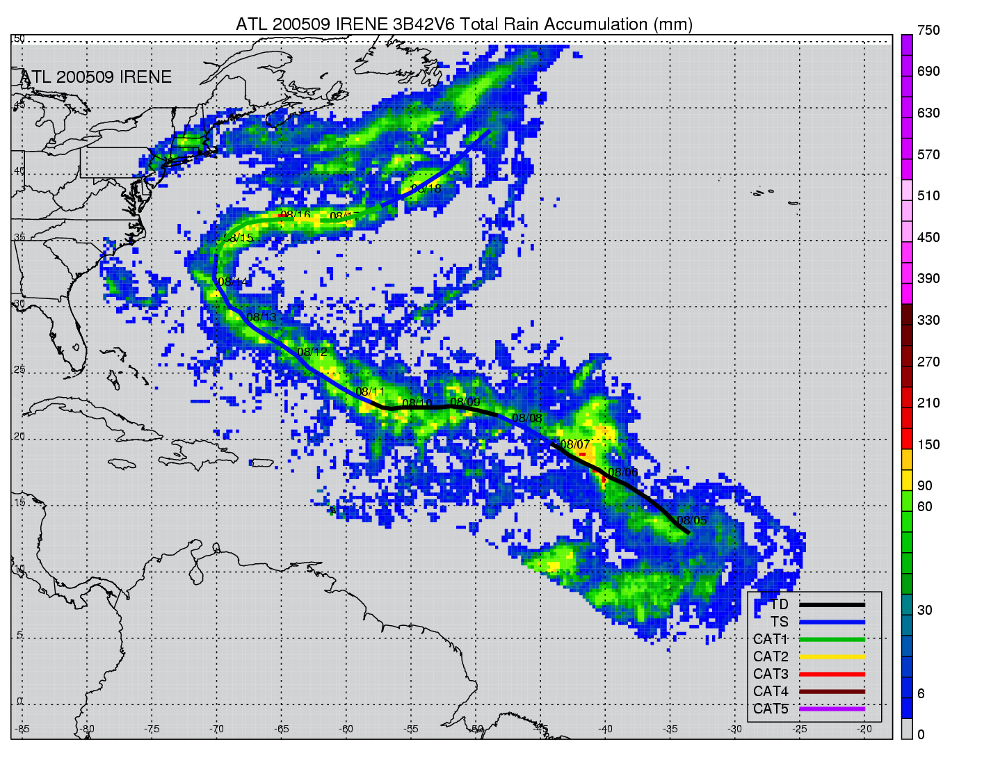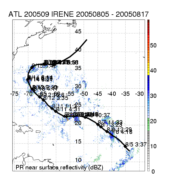 | 9 | 200509 | IRENE | 20050805 - 20050817 | 970 | 90 | 32 | 168 | snapshots | rain accumulation |