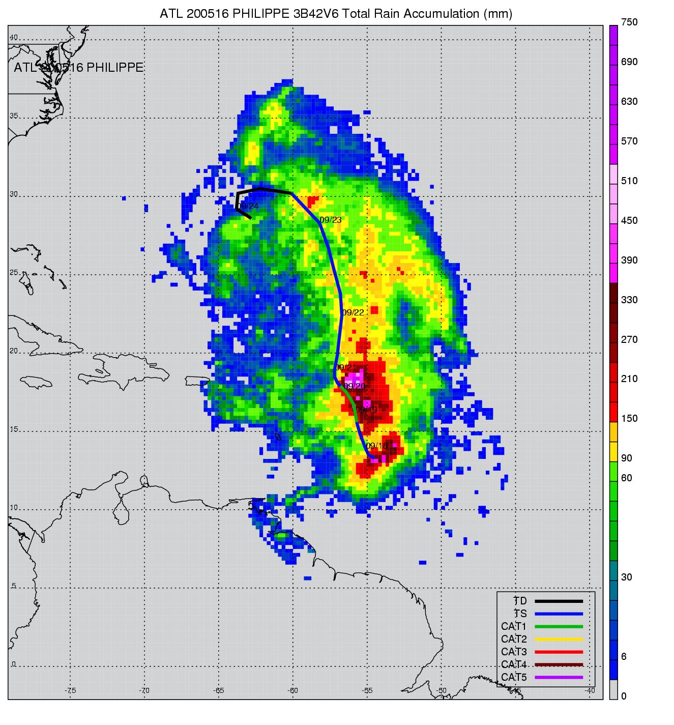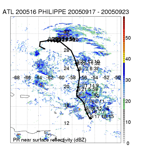| 16 | 200516 | PHILIPPE | 20050917 - 20050923 | 985 | 70 | 15 | 116 | snapshots | rain accumulation |