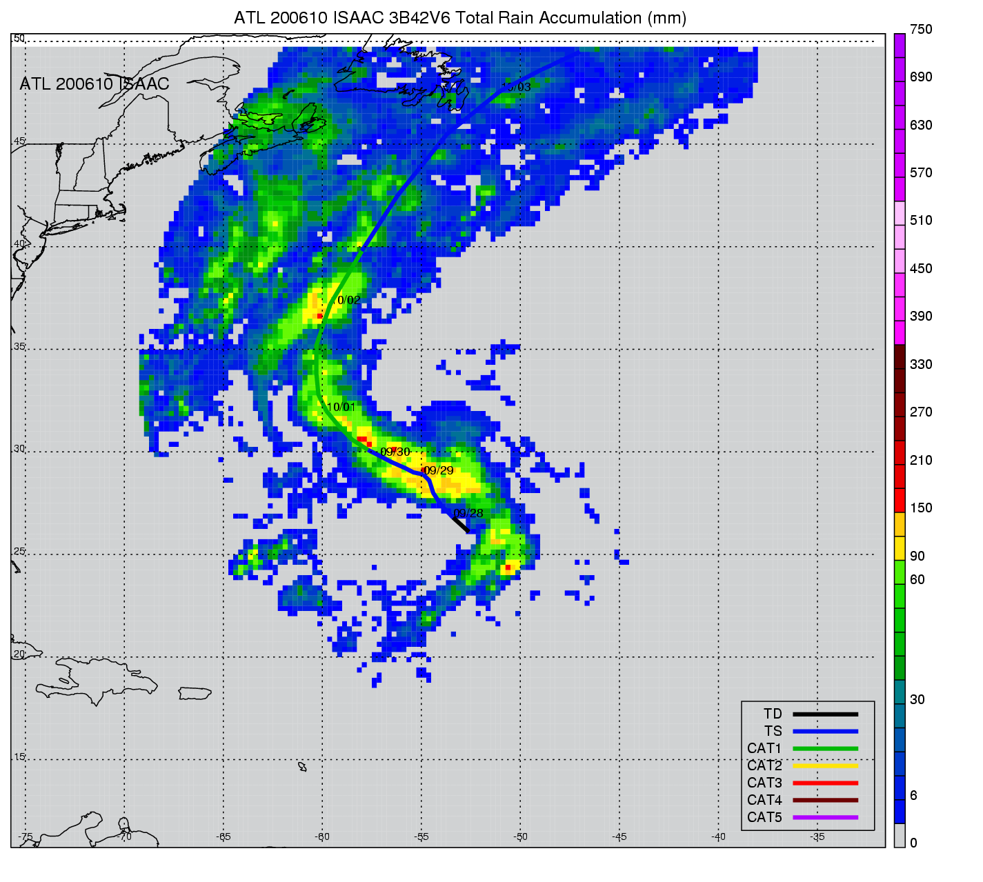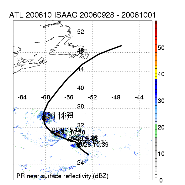 | 10 | 200610 | ISAAC | 20060928 - 20061001 | 985 | 75 | 11 | 50 | snapshots | rain accumulation |