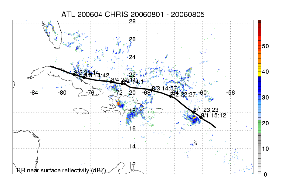 | 4 | 200604 | CHRIS | 20060801 - 20060805 | 1001 | 55 | 10 | 81 | snapshots | rain accumulation |