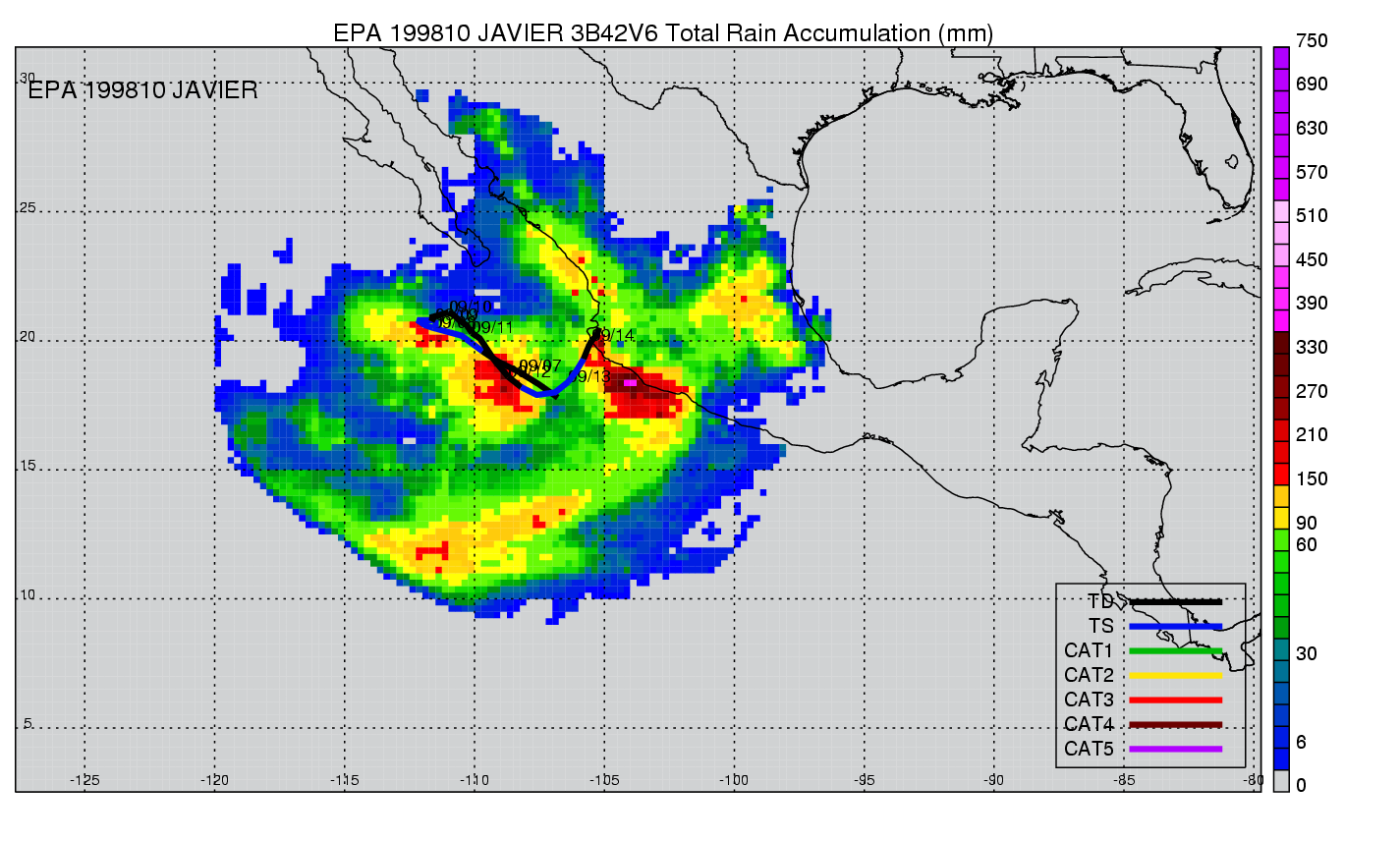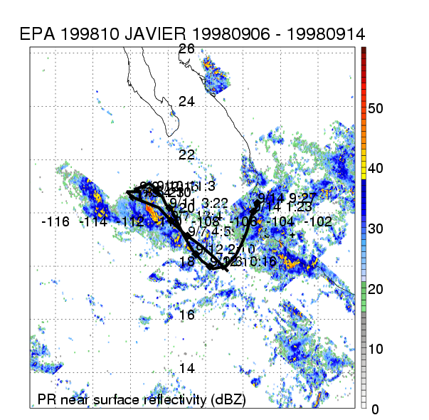 | 10 | 199810 | JAVIER | 19980906 - 19980914 | 995 | 50 | 17 | 114 | snapshots | rain accumulation |