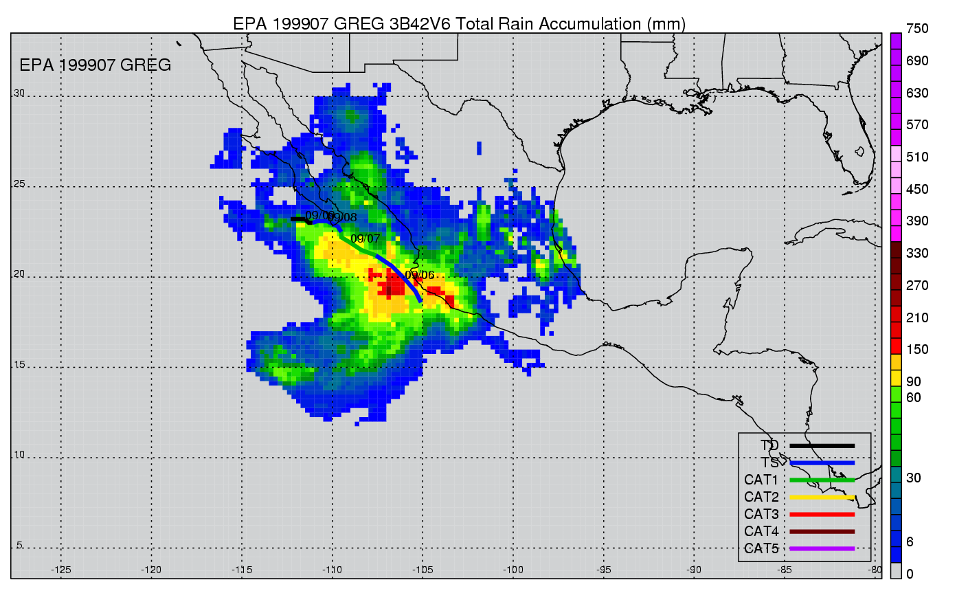 | 7 | 199907 | GREG | 19990906 - 19990909 | 986 | 65 | 8 | 47 | snapshots | rain accumulation |