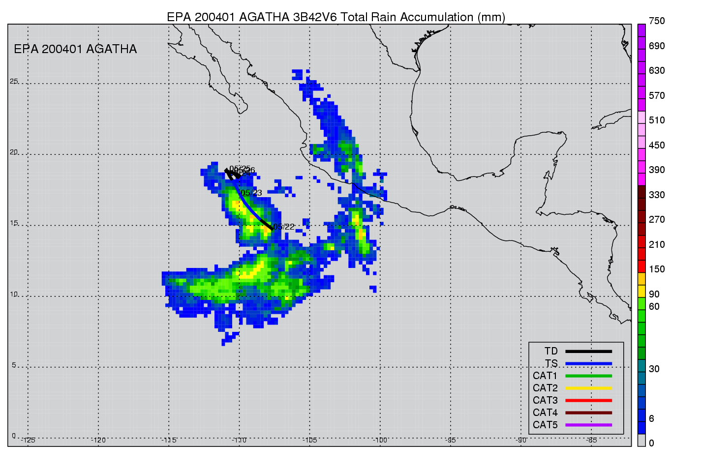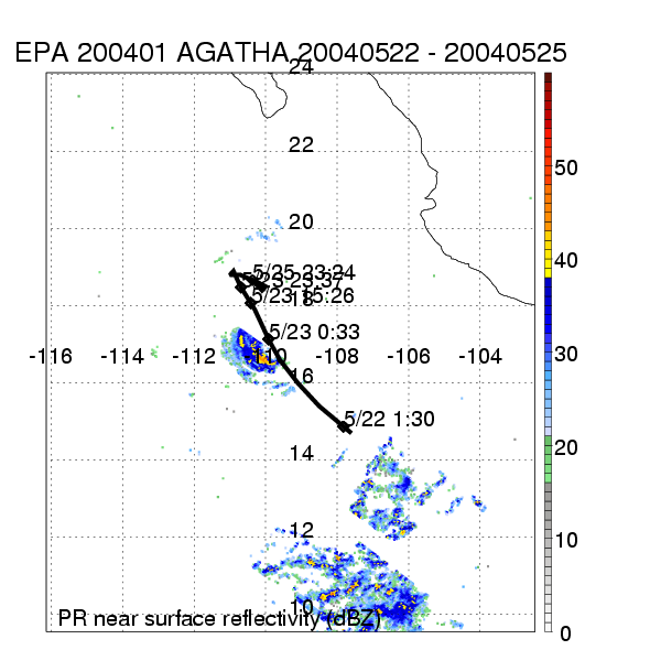 | 1 | 200401 | AGATHA | 20040522 - 20040525 | 997 | 50 | 5 | 18 | snapshots | rain accumulation |