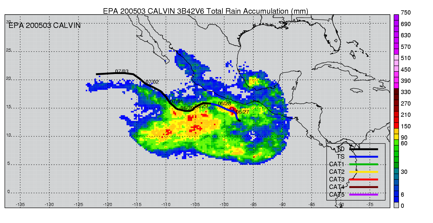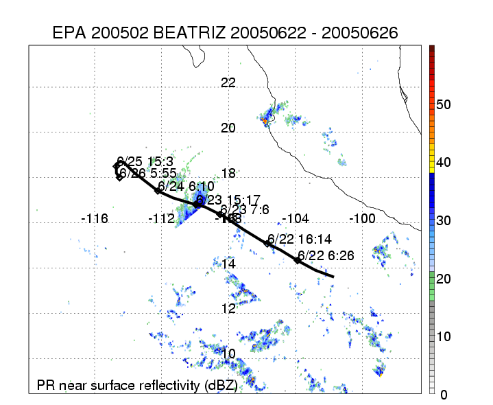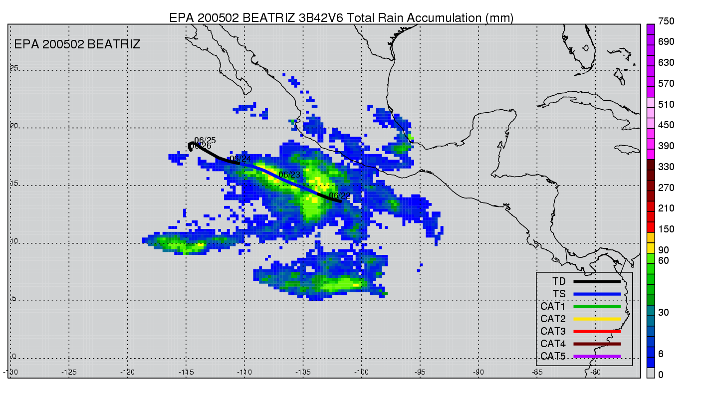 | 2 | 200502 | BEATRIZ | 20050622 - 20050626 | 1000 | 45 | 7 | 34 | snapshots | rain accumulation |