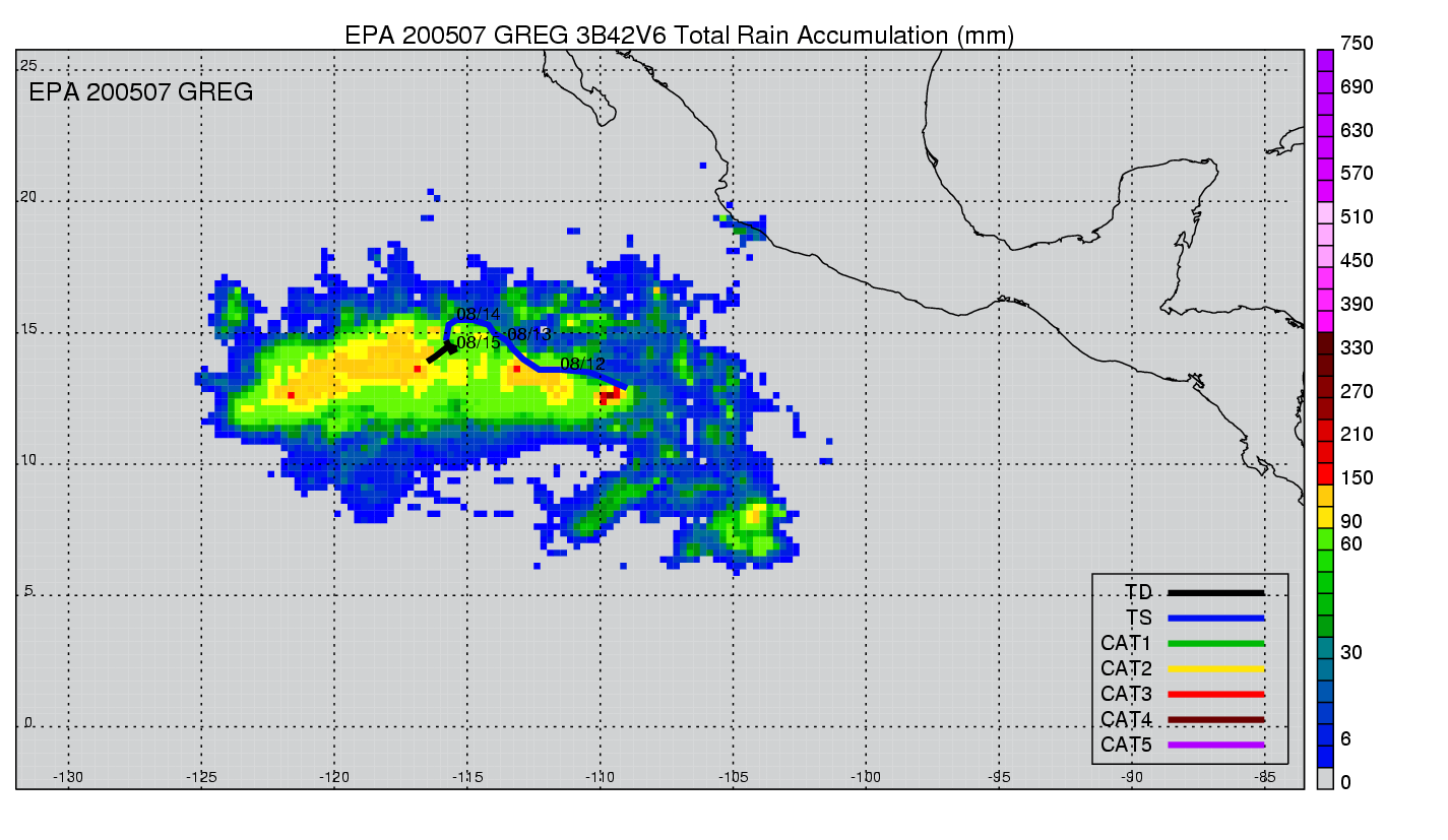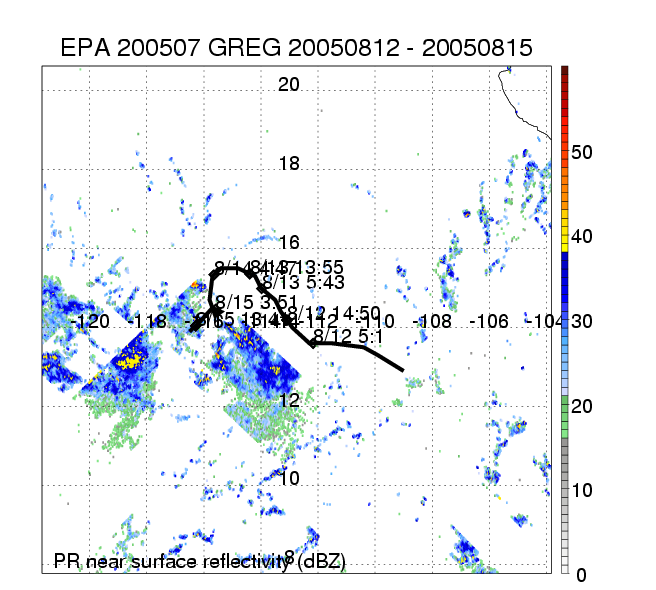 | 7 | 200507 | GREG | 20050812 - 20050815 | 1000 | 45 | 7 | 39 | snapshots | rain accumulation |