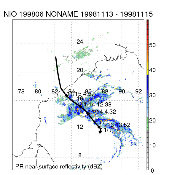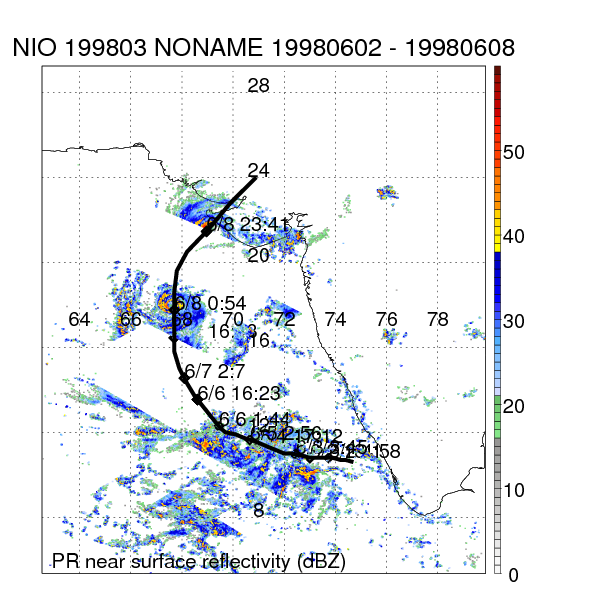| 6 | 199806 | NONAME | 19981113 - 19981115 | -9999999 | 85 | 6 | 49 | snapshots | rain accumulation |