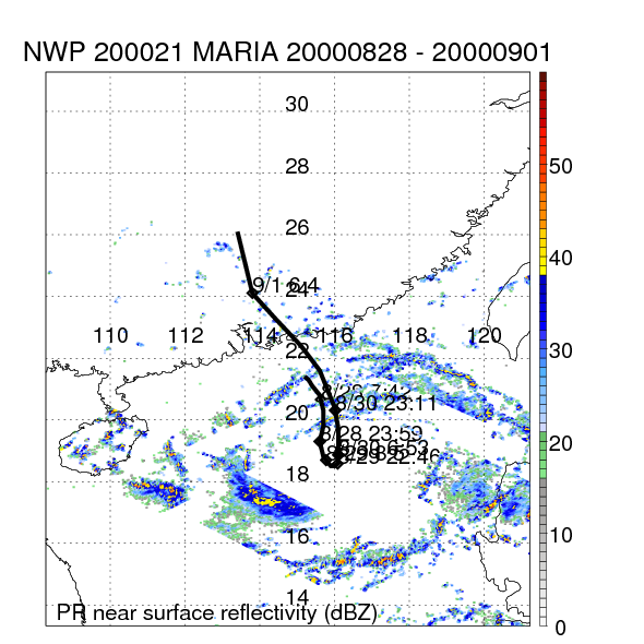 | 14 | 200021 | MARIA | 20000828 - 20000901 | -9999999 | 55 | 9 | 62 | snapshots | rain accumulation |