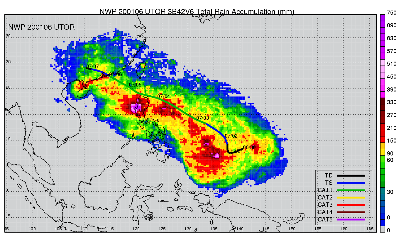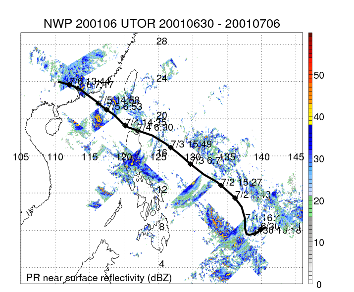 | 5 | 200106 | UTOR | 20010630 - 20010706 | -9999999 | 80 | 13 | 82 | snapshots | rain accumulation |