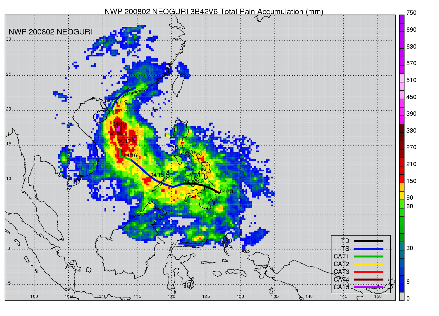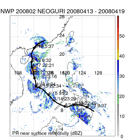 | 2 | 200802 | NEOGURI | 20080413 - 20080419 | 948 | 100 | 13 | 77 | snapshots | rain accumulation |