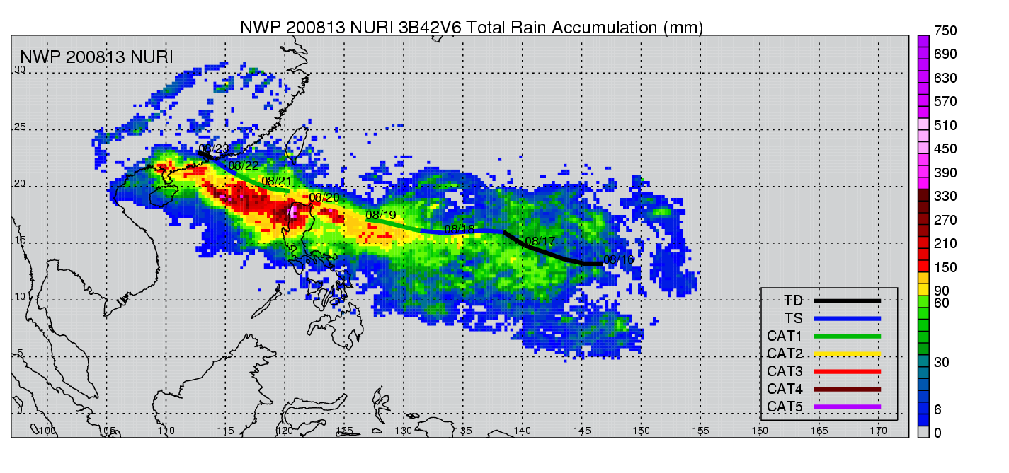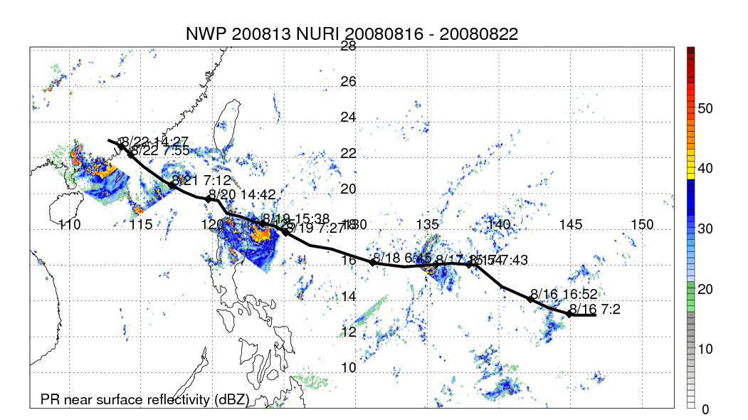 | 13 | 200813 | NURI | 20080816 - 20080822 | 948 | 100 | 13 | 87 | snapshots | rain accumulation |