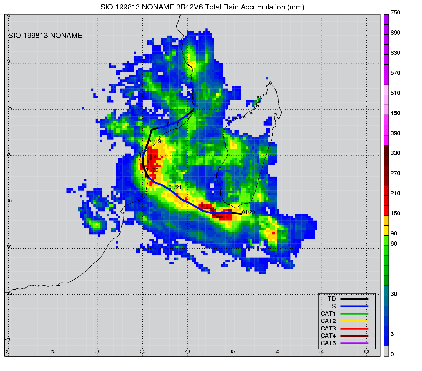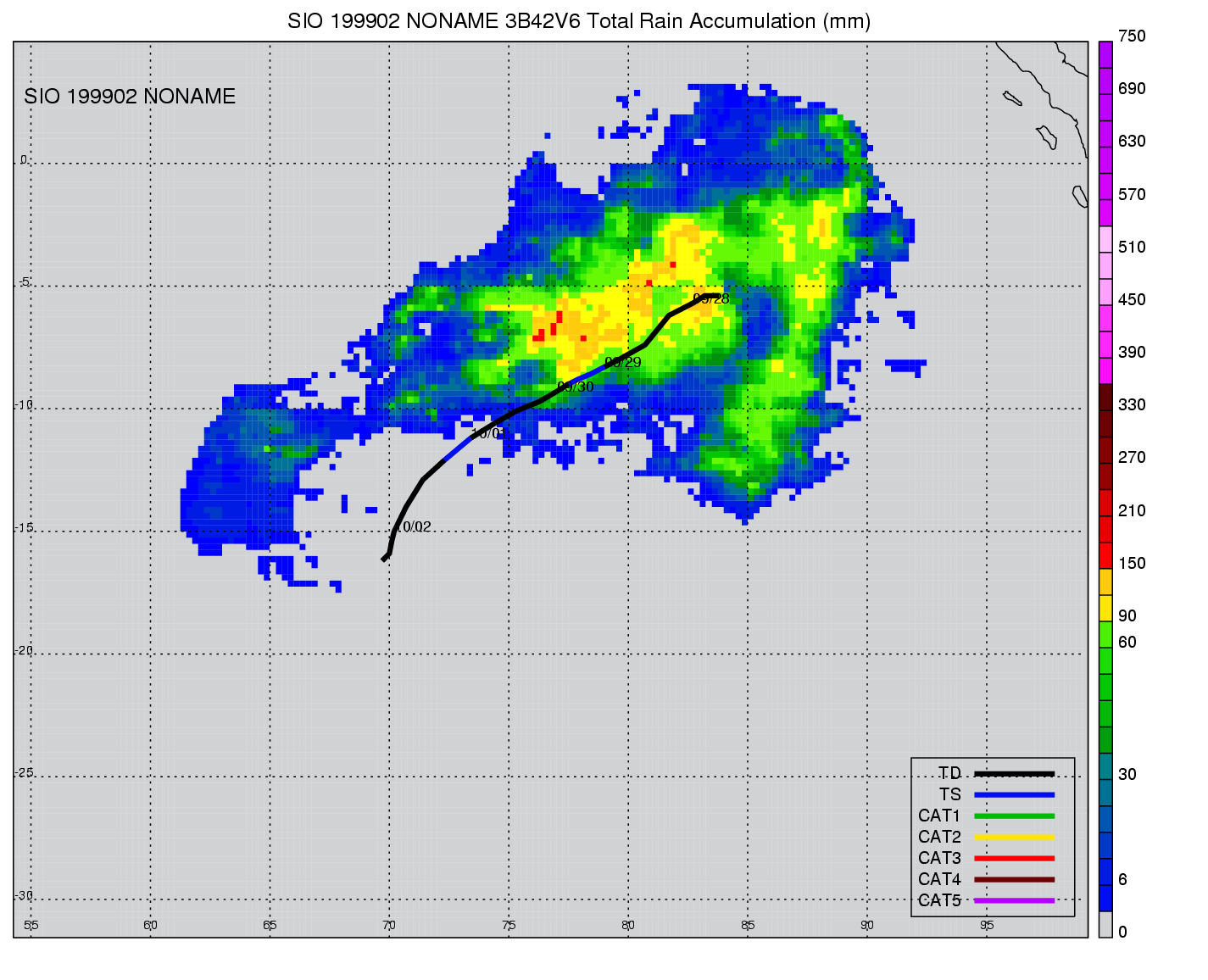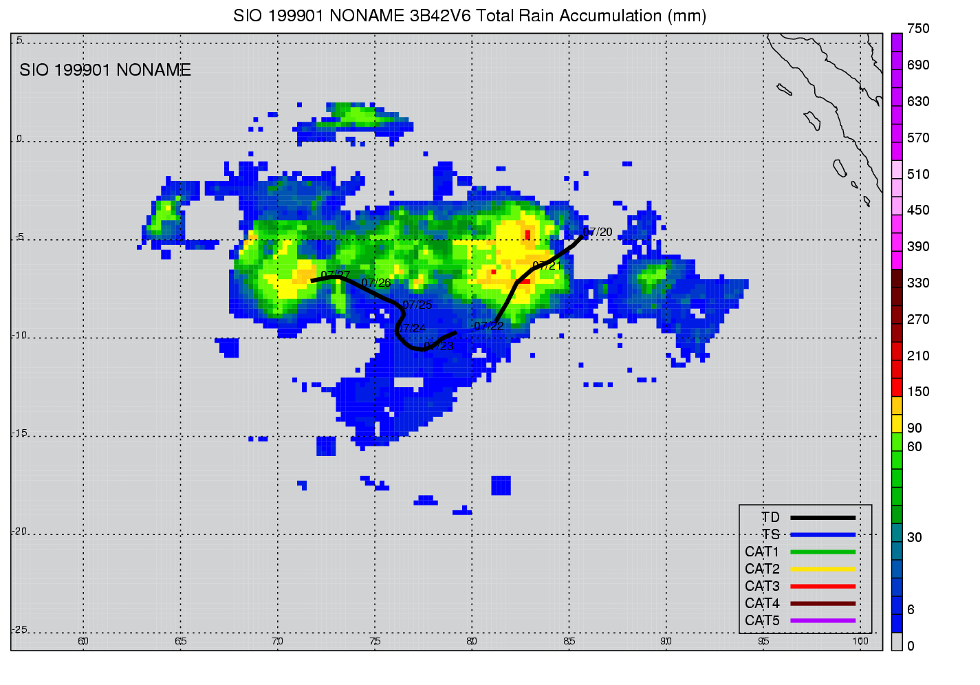 | 21 | 199910 | CATHY | 19981223 - 19981229 | -9999999 | 40 | 11 | 87 | snapshots | rain accumulation |
