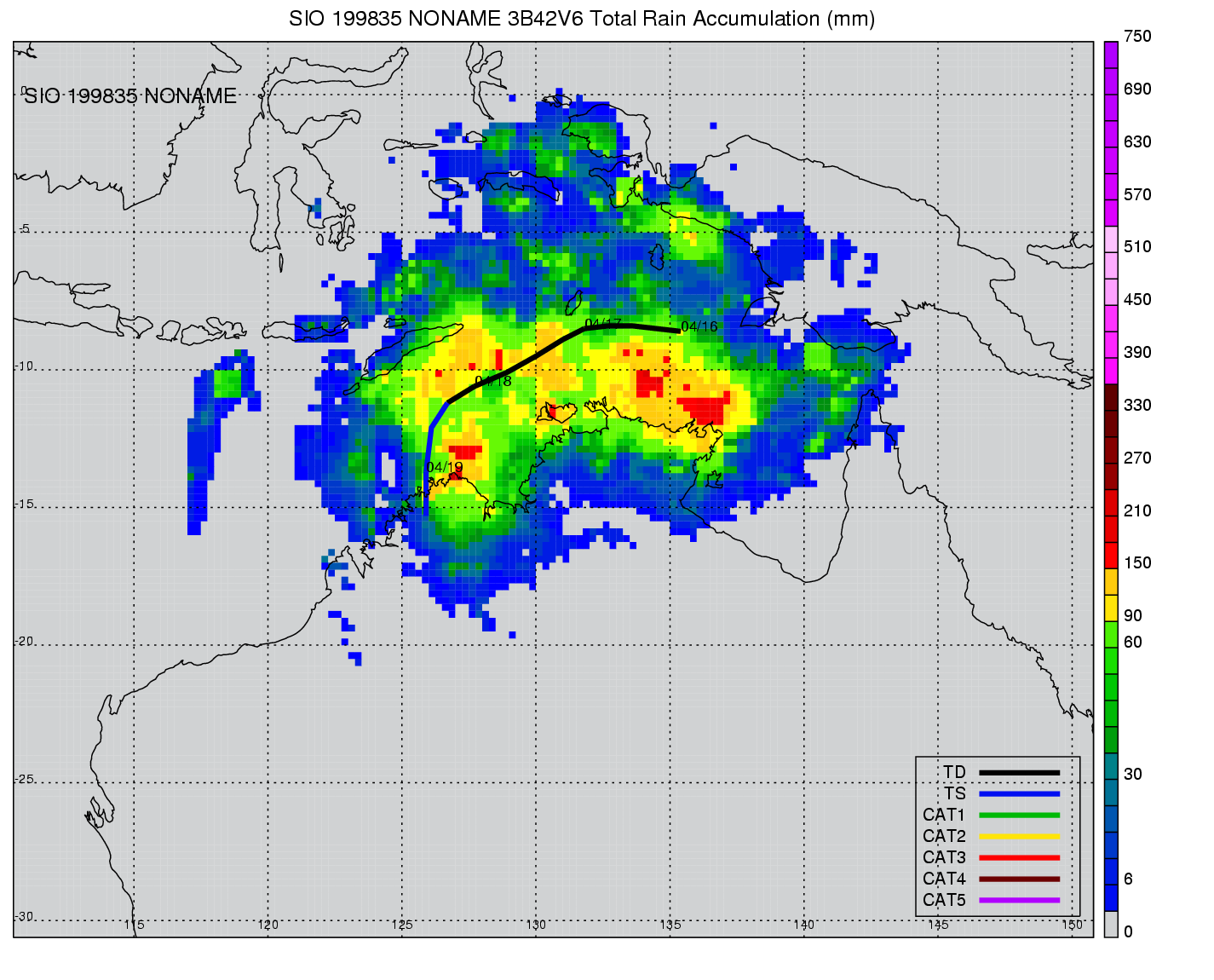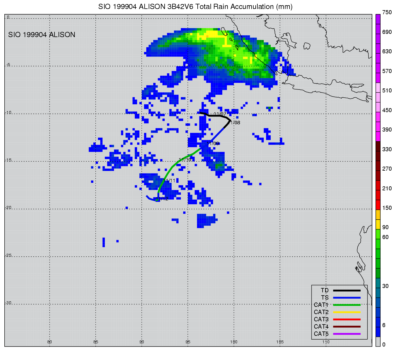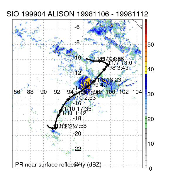 | 18 | 199904 | ALISON | 19981106 - 19981112 | -9999999 | 70 | 13 | 109 | snapshots | rain accumulation |