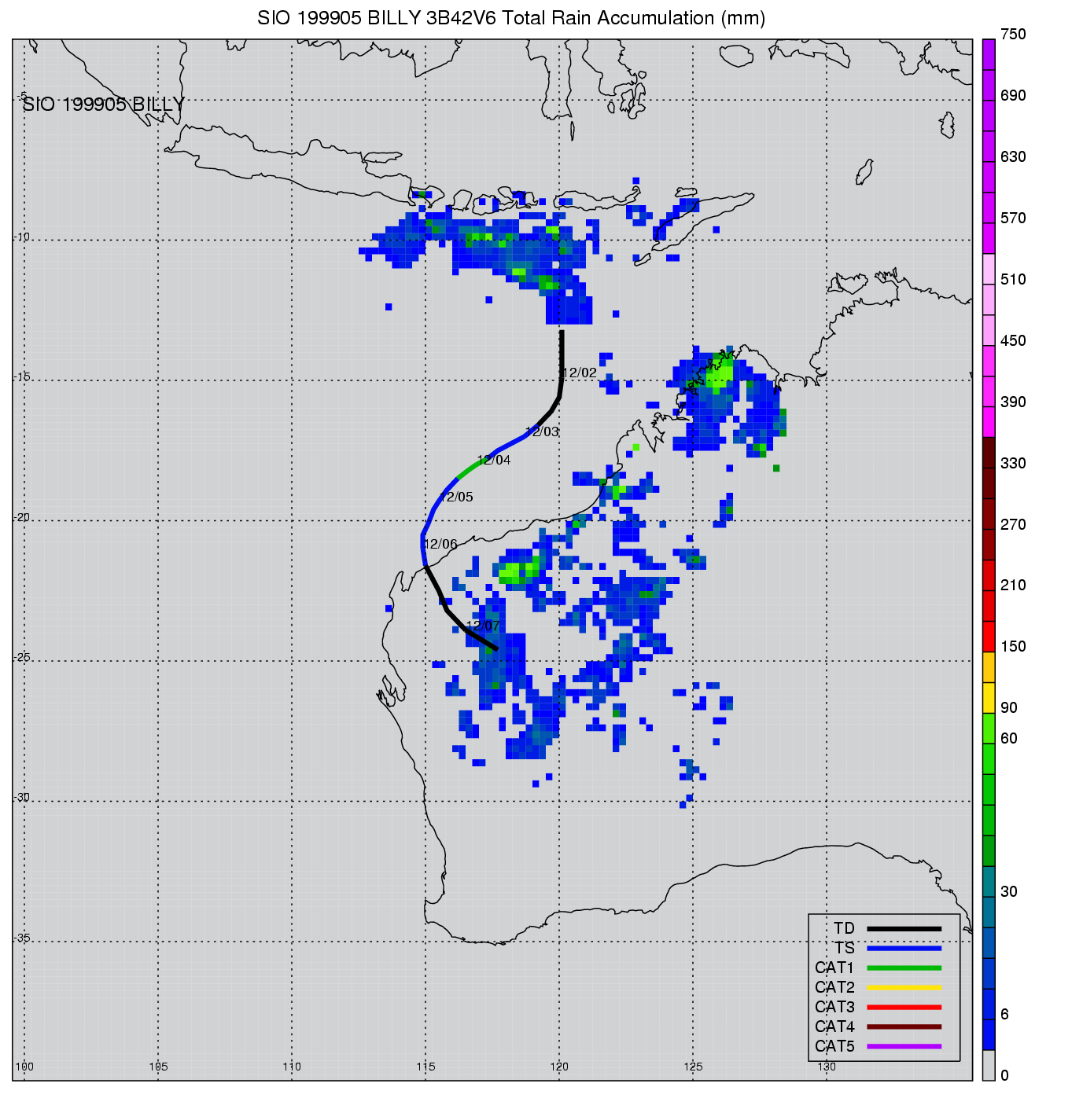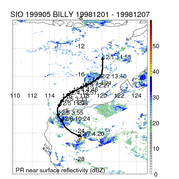 | 19 | 199905 | BILLY | 19981201 - 19981207 | -9999999 | 65 | 11 | 79 | snapshots | rain accumulation |