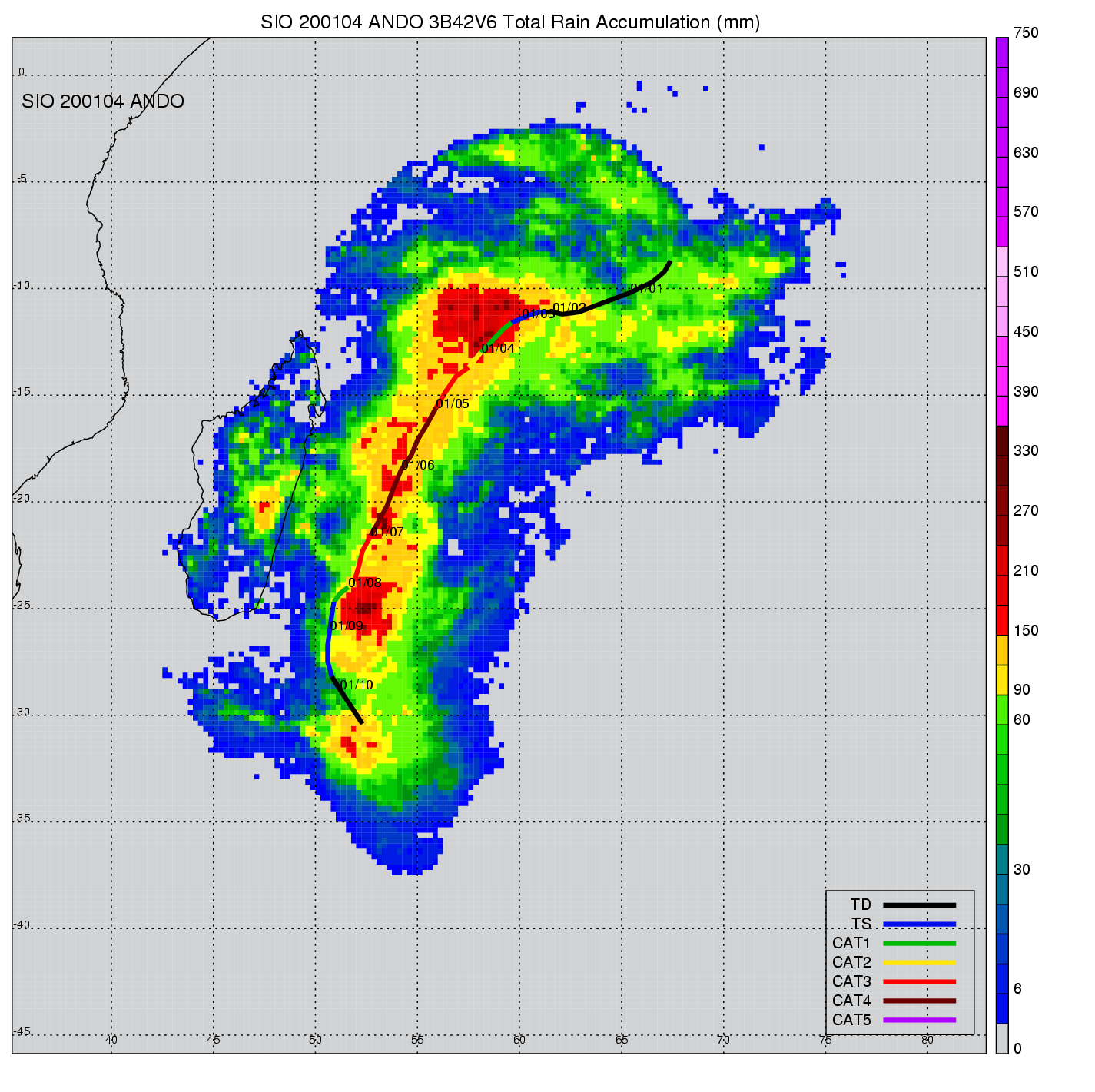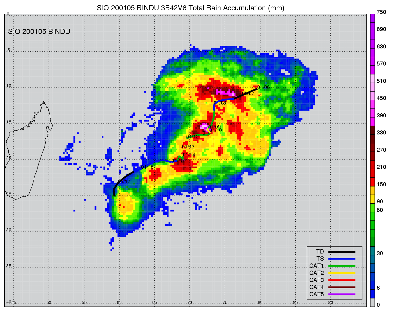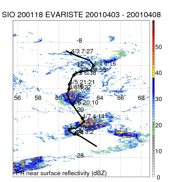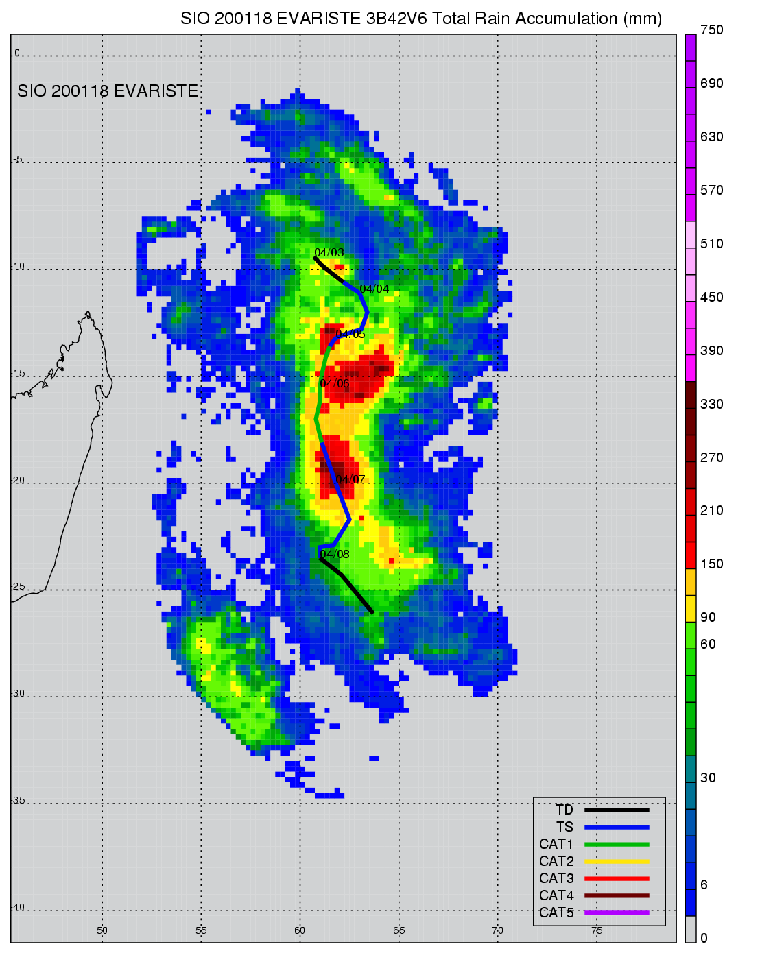 | 9 | 200118 | EVARISTE | 20010403 - 20010408 | -9999999 | 75 | 10 | 87 | snapshots | rain accumulation |