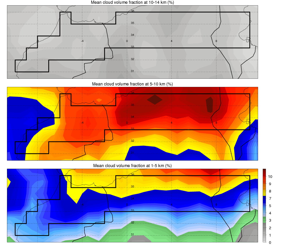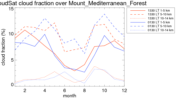 Over Mount_Mediterranean_Forest , mean high level (10-14 km) cloud volume fraction is about 1.7%. Mean mid level (5-10 km) cloud volume fraction is about 9.9%. Mean low level (1-5 km) cloud volume fraction is about 6.9%. Seasonal and day vs. night variations of high, mid and low level cloud fraction over Mount_Mediterranean_Forest are shown in following figure. You may check the details of cloud fraction in various seasons and at different local times. |