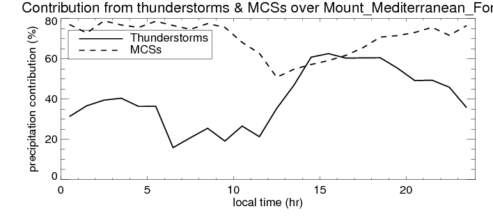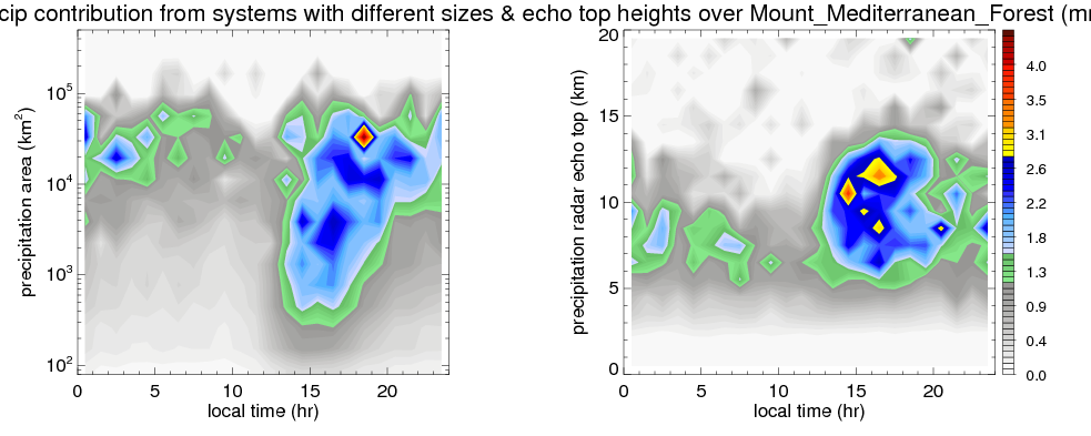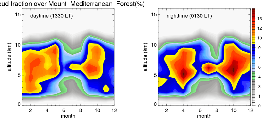 Many studies suggested that the diurnal variation of the precipitation is related to the life cycles of the precipitation systems, which is frequently driven by the surface sensible heating. Over Mount_Mediterranean_Forest, mean annual precipitation are estimated with 325.8 (mm/year) from precipitation radar. Detailed diurnal variation of the precipitation at high resolution can be accessed here (NOTE: it may take long time to generate for a large area). The diurnal variation of precipitation from systems with different sizes and heights are shown below: In total, thunderstorms (systems with detected lightning flashes) contribute 45 %, MCSs (Mesoscale convective systems with raining area > 2000 km^2) contribute 68 % of all precipitation over Mount_Mediterranean_Forest. Diurnal variations of fraction of precipitation from thunderstorms and MCSs over Mount_Mediterranean_Forest are shown below: Certainly there is a strong diurnal variation of different types of clouds. Because CloudSat observes at 0130 and 1330 local time, here the daytime and night cloud fraction in different seasons are presented: |