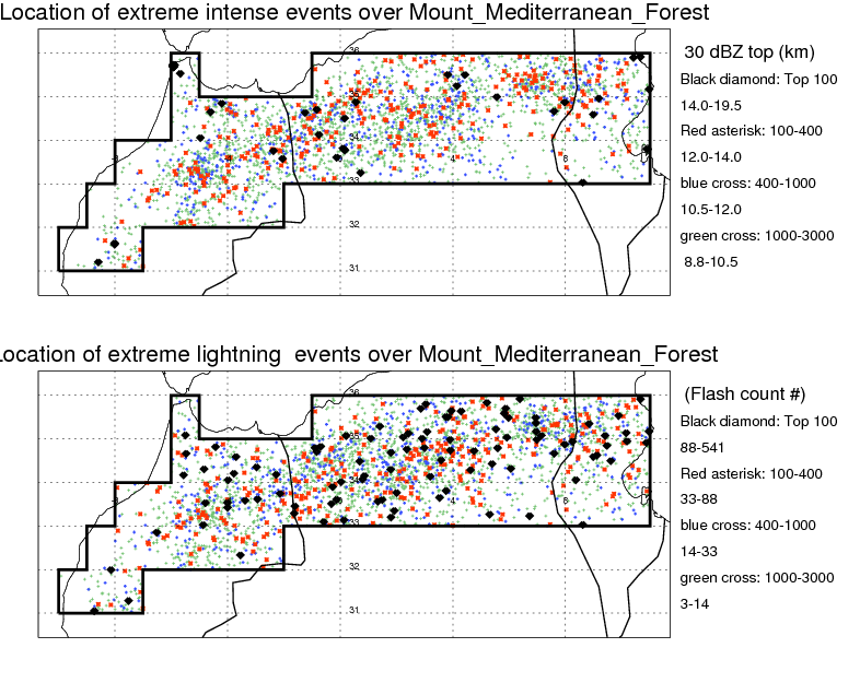 Following figure shows the location of the precipitation feautres categorized by the lightning rate and 30 dBZ echo top.
