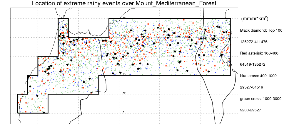 Following figure shows the location of the precipitation feautres categorized by the volumetric rainfall.