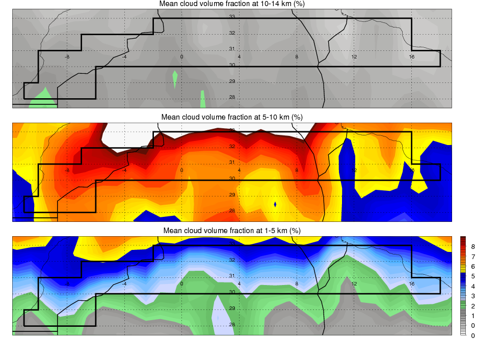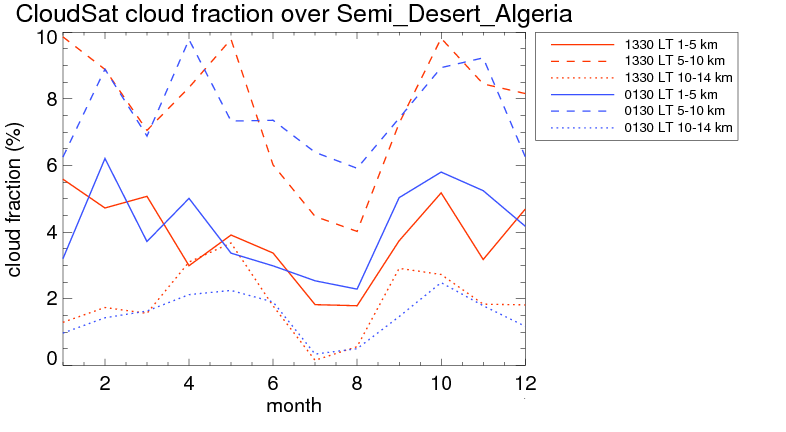 Over Semi_Desert_Algeria , mean high level (10-14 km) cloud volume fraction is about 1.8%. Mean mid level (5-10 km) cloud volume fraction is about 7.6%. Mean low level (1-5 km) cloud volume fraction is about 4.0%. Seasonal and day vs. night variations of high, mid and low level cloud fraction over Semi_Desert_Algeria are shown in following figure. You may check the details of cloud fraction in various seasons and at different local times. |