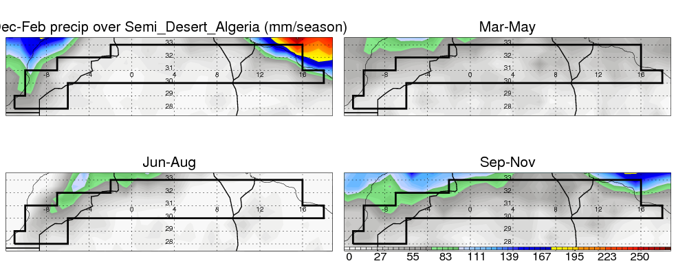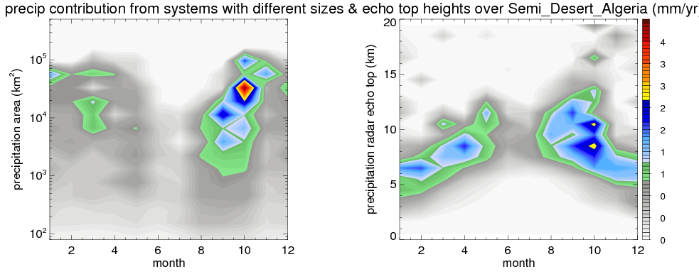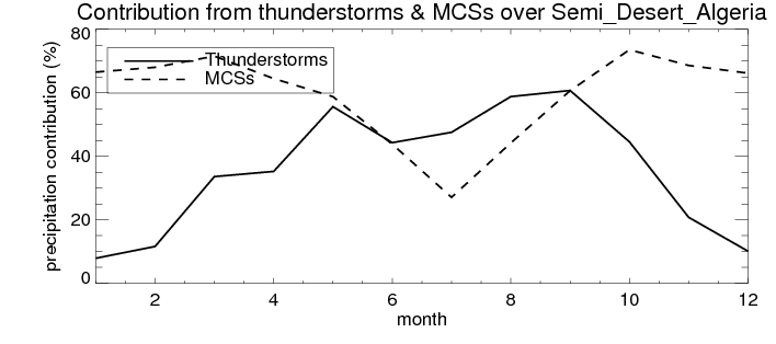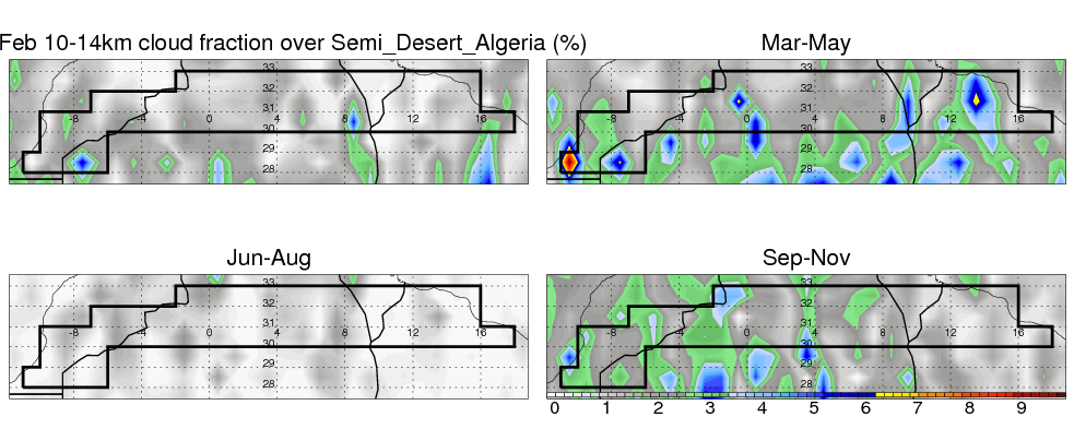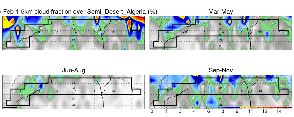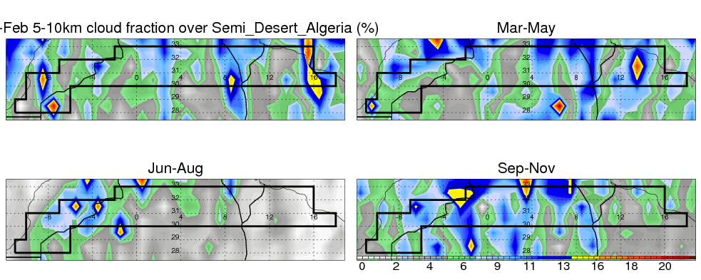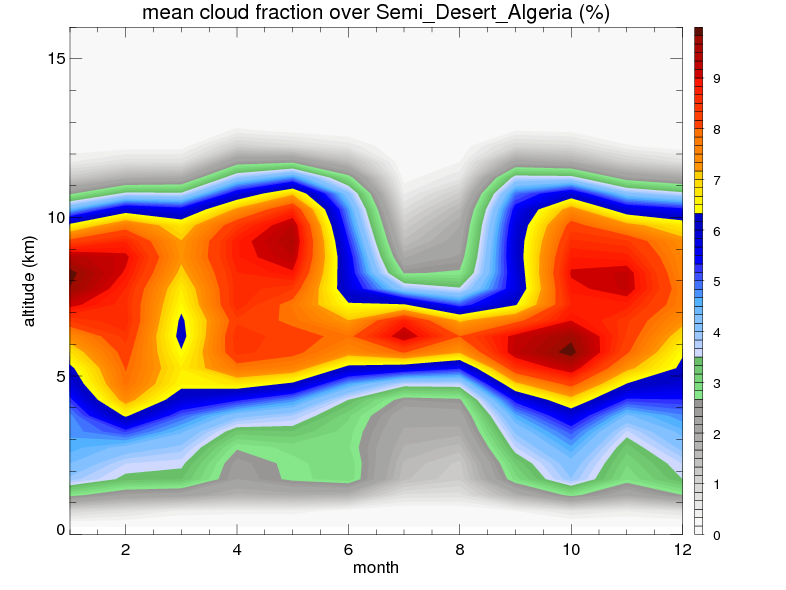 Over Semi_Desert_Algeria , mean annual precipitation are estimated with 138.4 (mm/year) from TRMM precipitation radar. (distribution of precipitation see here ) Total surface rainfall is brought by various precipitation systems. The seasonal variation of precipitation from systems with different sizes and heights are shown below: In total, thunderstorms (systems with detected lightning flashes) contribute 36 %, MCSs (Mesoscale convective systems with raining area > 2000 km^2) contribute 63 % of all precipitation. Seasonal variations of fraction of precipitation from thunderstorms and MCSs are shown below: The seasonal variation of geographical distribution of CloudSat cloud fraction over Semi_Desert_Algeria is shown below: The seasonal variation of mean CloudSat level cloud fraction at different altitudes over Semi_Desert_Algeria is shown below: |