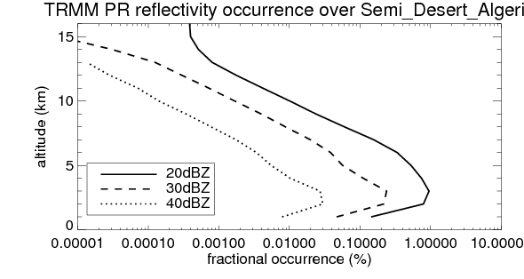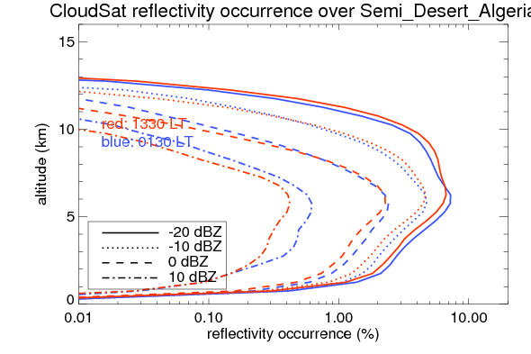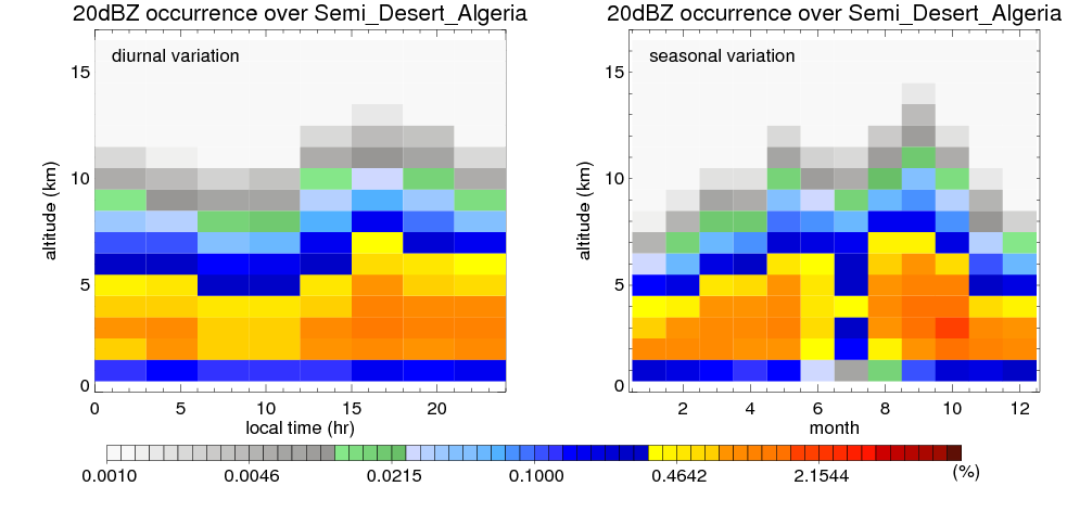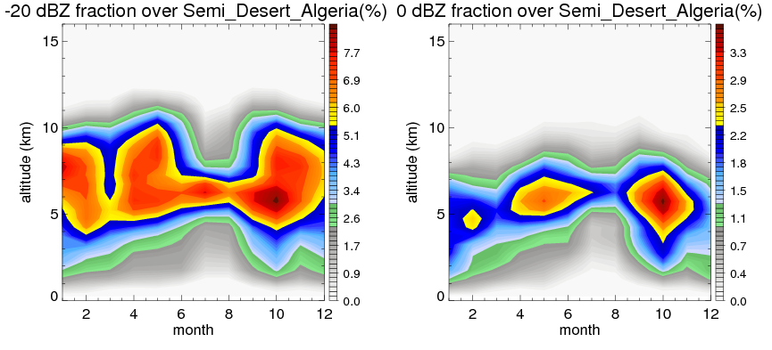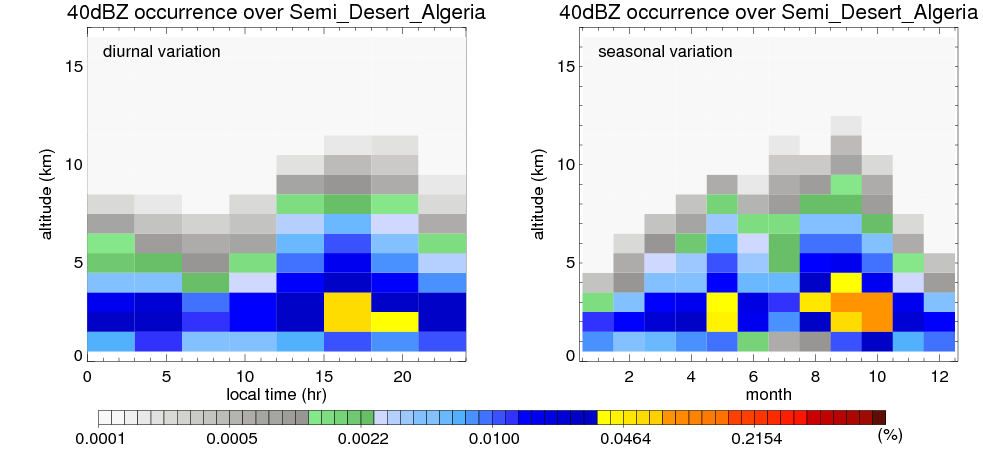 Here the precipitation means the precipitable hydrometeors (raindrops, snow flakes, graupel and hails) that detected by TRMM precipitation radar. Following figure shows the vertical profiles of 20, 30 and 40 dBZ fractional occurrence over Semi_Desert_Algeria in different seasons. The seasonal and diurnal variations of precipitation (20 dBZ) fractional occurrence at different altitudes are shown below: The seasonal and diurnal variations of INTENSIVE precipitation (40 dBZ) fractional occurrence at different altitudes are shown below: Clouds are consisted of small hydrometeors that undetectable by TRMM precipitation radar (Ku band). CloudSat (W band radar) provides the much great details of clouds. Following figure shows the vertical structure of the thin and thick clouds over Semi_Desert_Algeria. Note that high reflectivity at low levels are less frequent due to the attenuation. The seasonal variation of thin (-20 dBZ) and thick (0 dBZ) cloud over Semi_Desert_Algeria are shown below: |