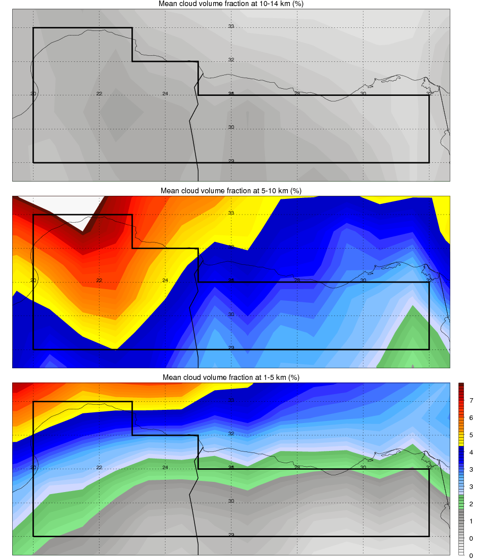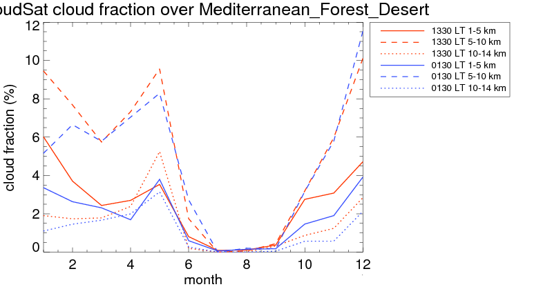 Over Mediterranean_Forest_Desert , mean high level (10-14 km) cloud volume fraction is about 1.3%. Mean mid level (5-10 km) cloud volume fraction is about 4.7%. Mean low level (1-5 km) cloud volume fraction is about 2.1%. Seasonal and day vs. night variations of high, mid and low level cloud fraction over Mediterranean_Forest_Desert are shown in following figure. You may check the details of cloud fraction in various seasons and at different local times. |