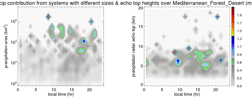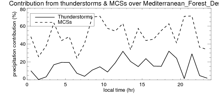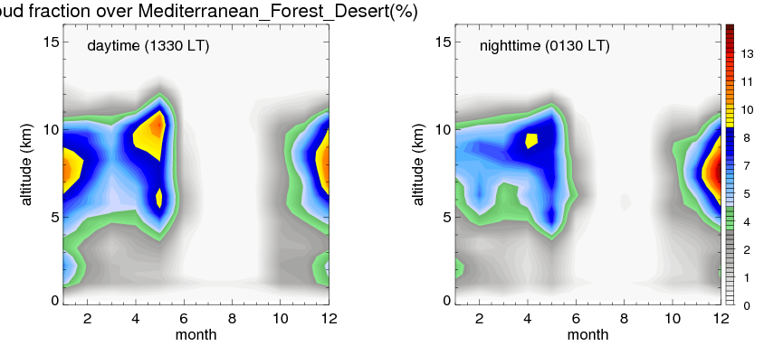 Many studies suggested that the diurnal variation of the precipitation is related to the life cycles of the precipitation systems, which is frequently driven by the surface sensible heating. Over Mediterranean_Forest_Desert, mean annual precipitation are estimated with 78.8 (mm/year) from precipitation radar. Detailed diurnal variation of the precipitation at high resolution can be accessed here (NOTE: it may take long time to generate for a large area). The diurnal variation of precipitation from systems with different sizes and heights are shown below: In total, thunderstorms (systems with detected lightning flashes) contribute 16 %, MCSs (Mesoscale convective systems with raining area > 2000 km^2) contribute 53 % of all precipitation over Mediterranean_Forest_Desert. Diurnal variations of fraction of precipitation from thunderstorms and MCSs over Mediterranean_Forest_Desert are shown below: Certainly there is a strong diurnal variation of different types of clouds. Because CloudSat observes at 0130 and 1330 local time, here the daytime and night cloud fraction in different seasons are presented: |
