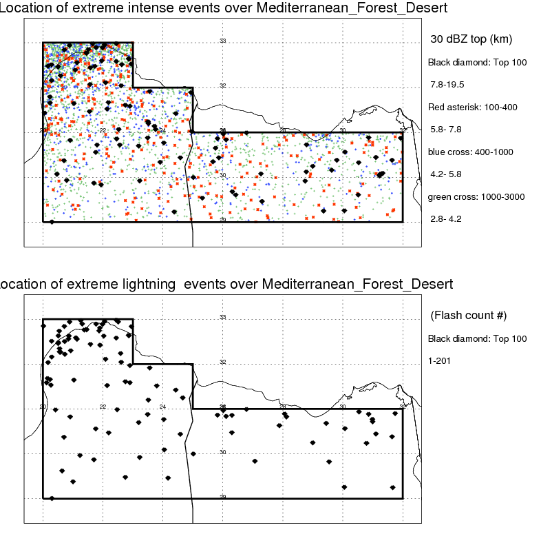 Following figure shows the location of the precipitation feautres categorized by the lightning rate and 30 dBZ echo top.
