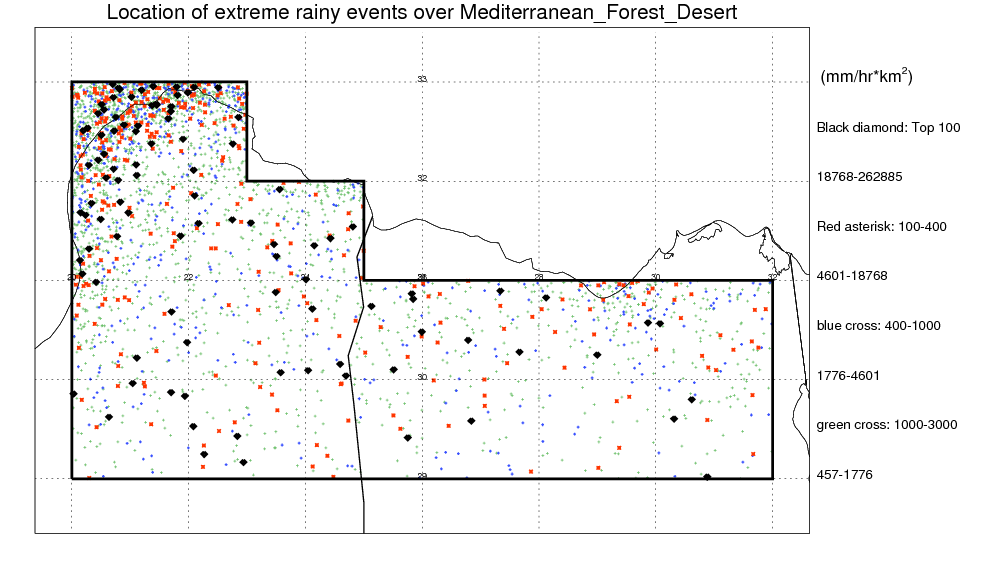 Following figure shows the location of the precipitation feautres categorized by the volumetric rainfall.