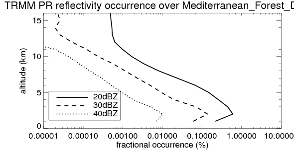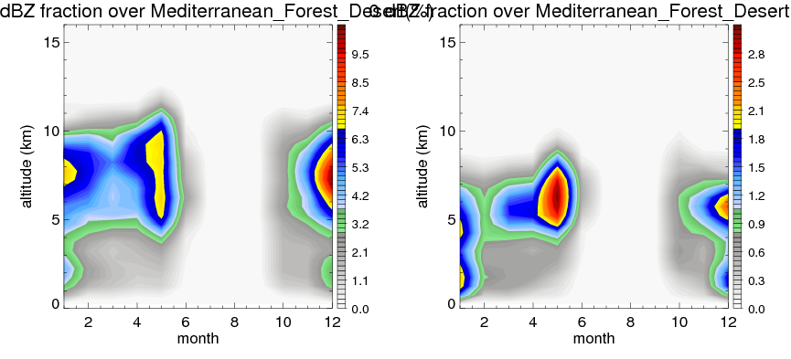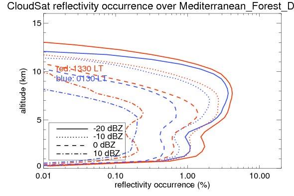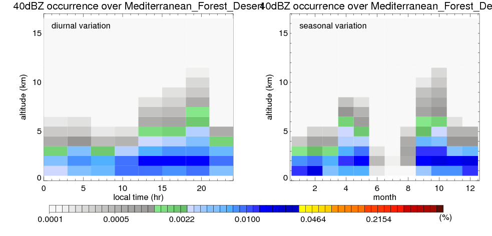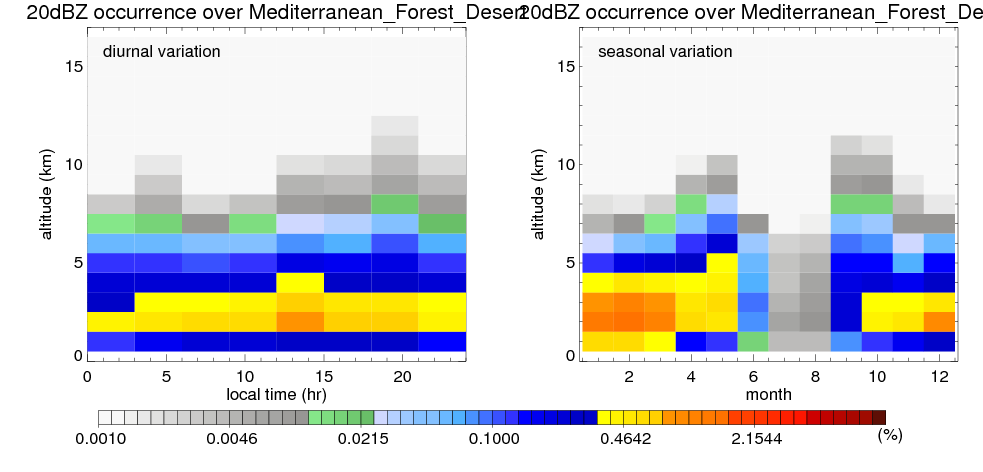 Here the precipitation means the precipitable hydrometeors (raindrops, snow flakes, graupel and hails) that detected by TRMM precipitation radar. Following figure shows the vertical profiles of 20, 30 and 40 dBZ fractional occurrence over Mediterranean_Forest_Desert in different seasons. The seasonal and diurnal variations of precipitation (20 dBZ) fractional occurrence at different altitudes are shown below: The seasonal and diurnal variations of INTENSIVE precipitation (40 dBZ) fractional occurrence at different altitudes are shown below: Clouds are consisted of small hydrometeors that undetectable by TRMM precipitation radar (Ku band). CloudSat (W band radar) provides the much great details of clouds. Following figure shows the vertical structure of the thin and thick clouds over Mediterranean_Forest_Desert. Note that high reflectivity at low levels are less frequent due to the attenuation. The seasonal variation of thin (-20 dBZ) and thick (0 dBZ) cloud over Mediterranean_Forest_Desert are shown below: |