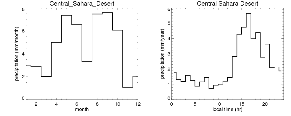 Over Central_Sahara_Desert , mean annual precipitation are estimated with 54.3 (mm/year) from precipitation radar, and 21.5 (mm/year) from microwave radiometer observations. (see high resolution precipitation product , NOTE: it may take long time to generate for large area) In total, thunderstorms (systems with detected lightning flashes) contribute 43 %, MCSs (Mesoscale convective systems with raining area > 2000 km^2) contribute 50 % of all precipitation. Seasonal and diurnal variations of rainfall over Central_Sahara_Desert are shown in following figure. You may check the details of rainfall contributions from precipitation systems with different sizes and intensities in various seasons and at different local times. |