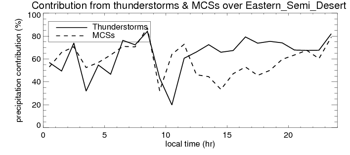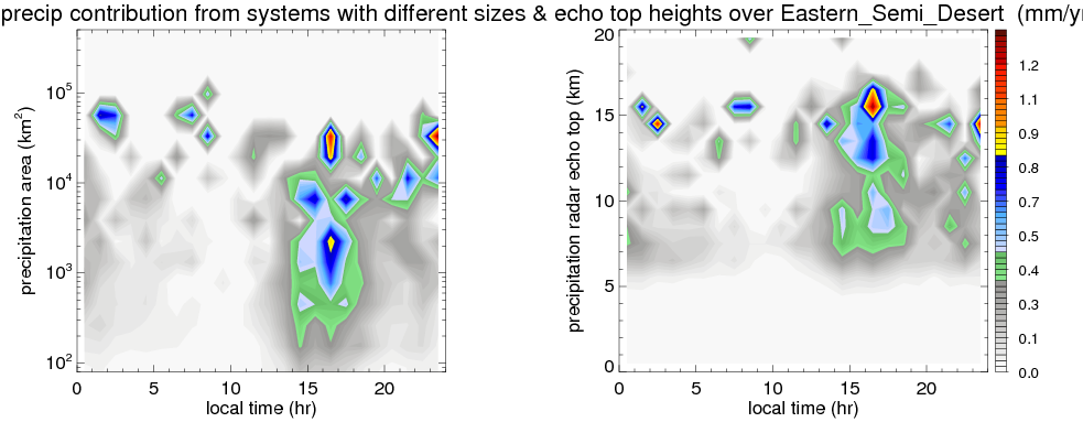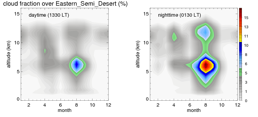 Many studies suggested that the diurnal variation of the precipitation is related to the life cycles of the precipitation systems, which is frequently driven by the surface sensible heating. Over Eastern_Semi_Desert , mean annual precipitation are estimated with 59.3 (mm/year) from precipitation radar. Detailed diurnal variation of the precipitation at high resolution can be accessed here (NOTE: it may take long time to generate for a large area). The diurnal variation of precipitation from systems with different sizes and heights are shown below: In total, thunderstorms (systems with detected lightning flashes) contribute 68 %, MCSs (Mesoscale convective systems with raining area > 2000 km^2) contribute 57 % of all precipitation over Eastern_Semi_Desert . Diurnal variations of fraction of precipitation from thunderstorms and MCSs over Eastern_Semi_Desert are shown below: Certainly there is a strong diurnal variation of different types of clouds. Because CloudSat observes at 0130 and 1330 local time, here the daytime and night cloud fraction in different seasons are presented: |