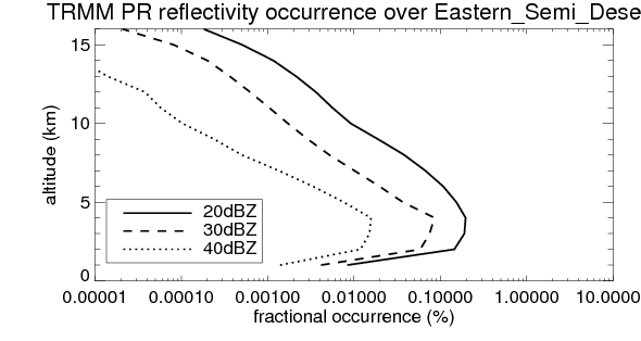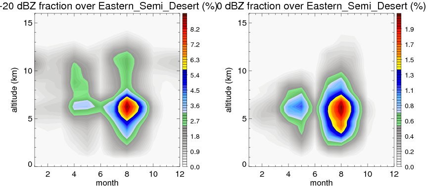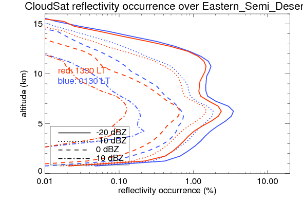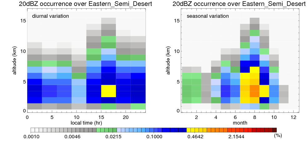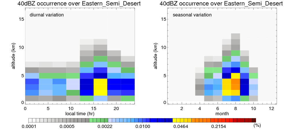 Here the precipitation means the precipitable hydrometeors (raindrops, snow flakes, graupel and hails) that detected by TRMM precipitation radar. Following figure shows the vertical profiles of 20, 30 and 40 dBZ fractional occurrence over Eastern_Semi_Desert in different seasons. The seasonal and diurnal variations of precipitation (20 dBZ) fractional occurrence at different altitudes are shown below: The seasonal and diurnal variations of INTENSIVE precipitation (40 dBZ) fractional occurrence at different altitudes are shown below: Clouds are consisted of small hydrometeors that undetectable by TRMM precipitation radar (Ku band). CloudSat (W band radar) provides the much great details of clouds. Following figure shows the vertical structure of the thin and thick clouds over Eastern_Semi_Desert . Note that high reflectivity at low levels are less frequent due to the attenuation. The seasonal variation of thin (-20 dBZ) and thick (0 dBZ) cloud over Eastern_Semi_Desert are shown below: |