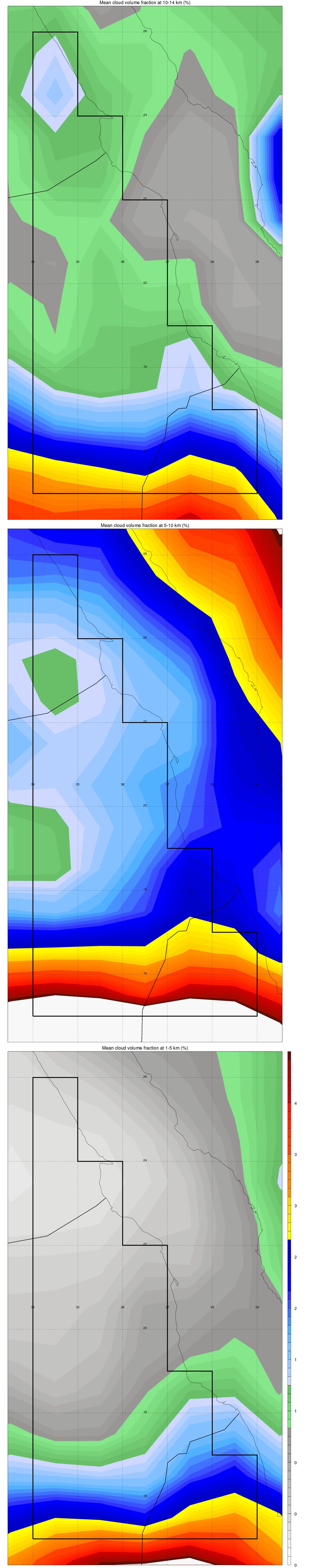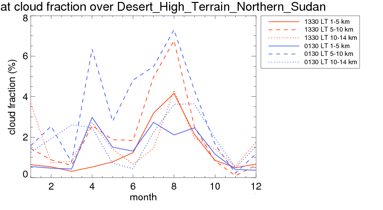 Over Desert_High_Terrain_Northern_Sudan , mean high level (10-14 km) cloud volume fraction is about 1.8%. Mean mid level (5-10 km) cloud volume fraction is about 2.6%. Mean low level (1-5 km) cloud volume fraction is about 1.4%. Seasonal and day vs. night variations of high, mid and low level cloud fraction over Desert_High_Terrain_Northern_Sudan are shown in following figure. You may check the details of cloud fraction in various seasons and at different local times. |