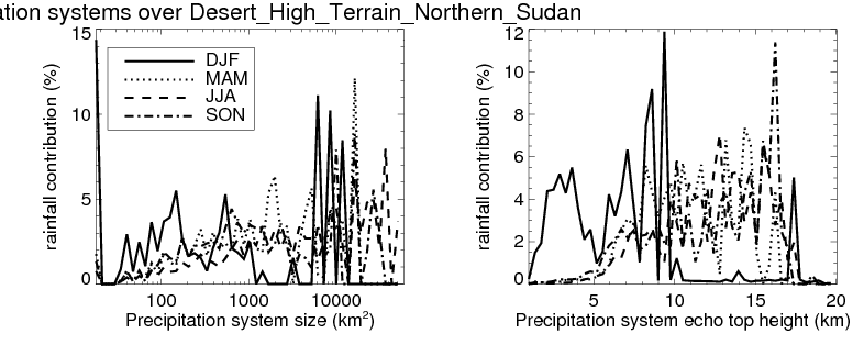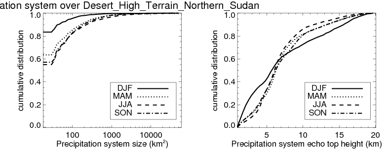 Over Desert_High_Terrain_Northern_Sudan , mean size of precipitation system about 173.9 (km^2) and mean maximum radar echo top height of these precipitation systems is about 7.3 km. Following figure shows the cumulative distribution of the sizes and depths of the precipitation systems in different seasons: Though usually there are more small systems, the larger systems would bring more total precipitation. |