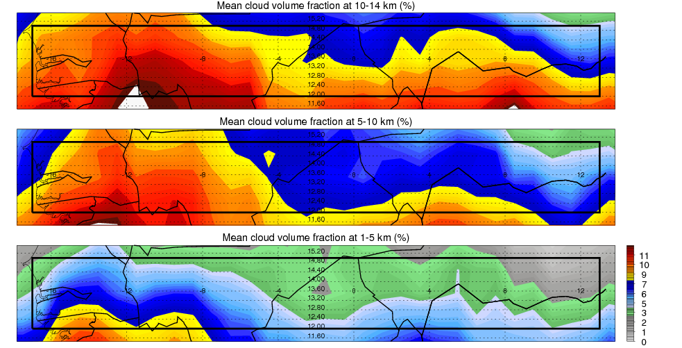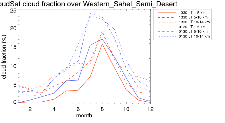 Over Western_Sahel_Semi_Desert , mean high level (10-14 km) cloud volume fraction is about 9.7%. Mean mid level (5-10 km) cloud volume fraction is about 8.4%. Mean low level (1-5 km) cloud volume fraction is about 5.1%. Seasonal and day vs. night variations of high, mid and low level cloud fraction over Western_Sahel_Semi_Desert are shown in following figure. You may check the details of cloud fraction in various seasons and at different local times. |