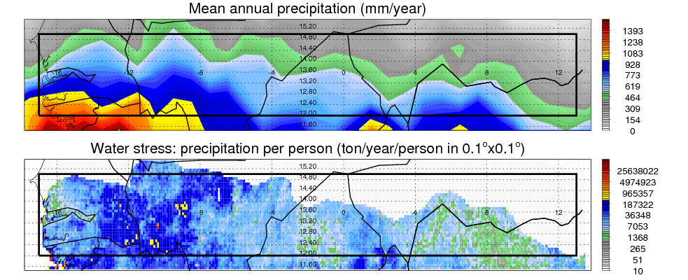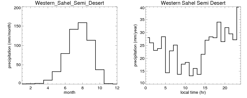 Over Western_Sahel_Semi_Desert , mean annual precipitation are estimated with 578.9 (mm/year) from precipitation radar, and 712.0 (mm/year) from microwave radiometer observations. (see high resolution precipitation product , NOTE: it may take long time to generate for large area) In total, thunderstorms (systems with detected lightning flashes) contribute 78 %, MCSs (Mesoscale convective systems with raining area > 2000 km^2) contribute 83 % of all precipitation. Seasonal and diurnal variations of rainfall over Western_Sahel_Semi_Desert are shown in following figure. You may check the details of rainfall contributions from precipitation systems with different sizes and intensities in various seasons and at different local times. |