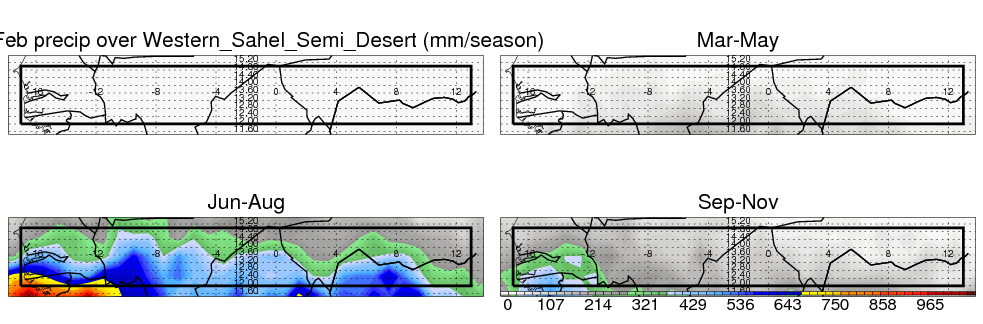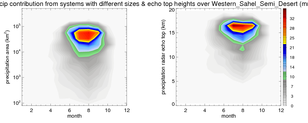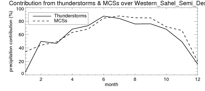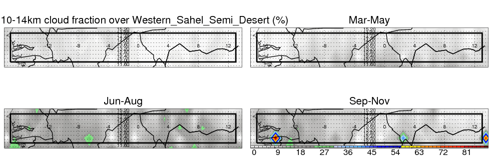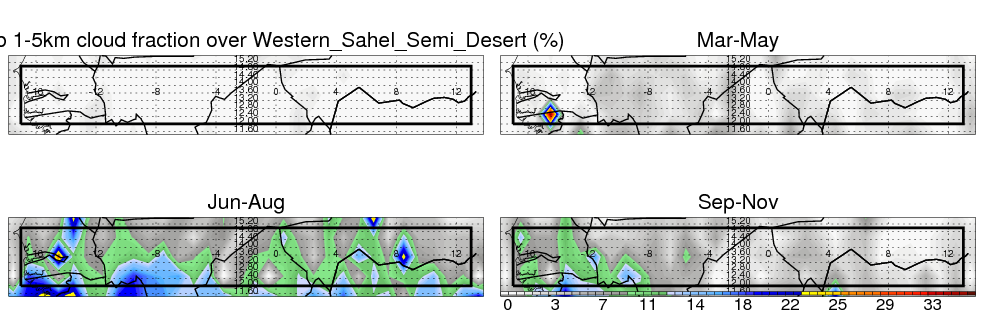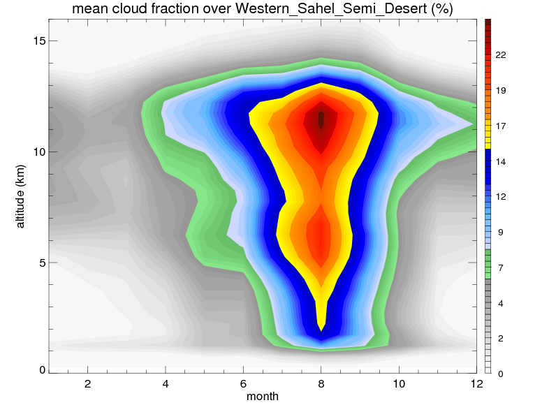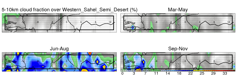 Over Western_Sahel_Semi_Desert , mean annual precipitation are estimated with 578.9 (mm/year) from TRMM precipitation radar. (distribution of precipitation see here ) Total surface rainfall is brought by various precipitation systems. The seasonal variation of precipitation from systems with different sizes and heights are shown below: In total, thunderstorms (systems with detected lightning flashes) contribute 78 %, MCSs (Mesoscale convective systems with raining area > 2000 km^2) contribute 83 % of all precipitation. Seasonal variations of fraction of precipitation from thunderstorms and MCSs are shown below: The seasonal variation of geographical distribution of CloudSat cloud fraction over Western_Sahel_Semi_Desert is shown below: The seasonal variation of mean CloudSat level cloud fraction at different altitudes over Western_Sahel_Semi_Desert is shown below: |