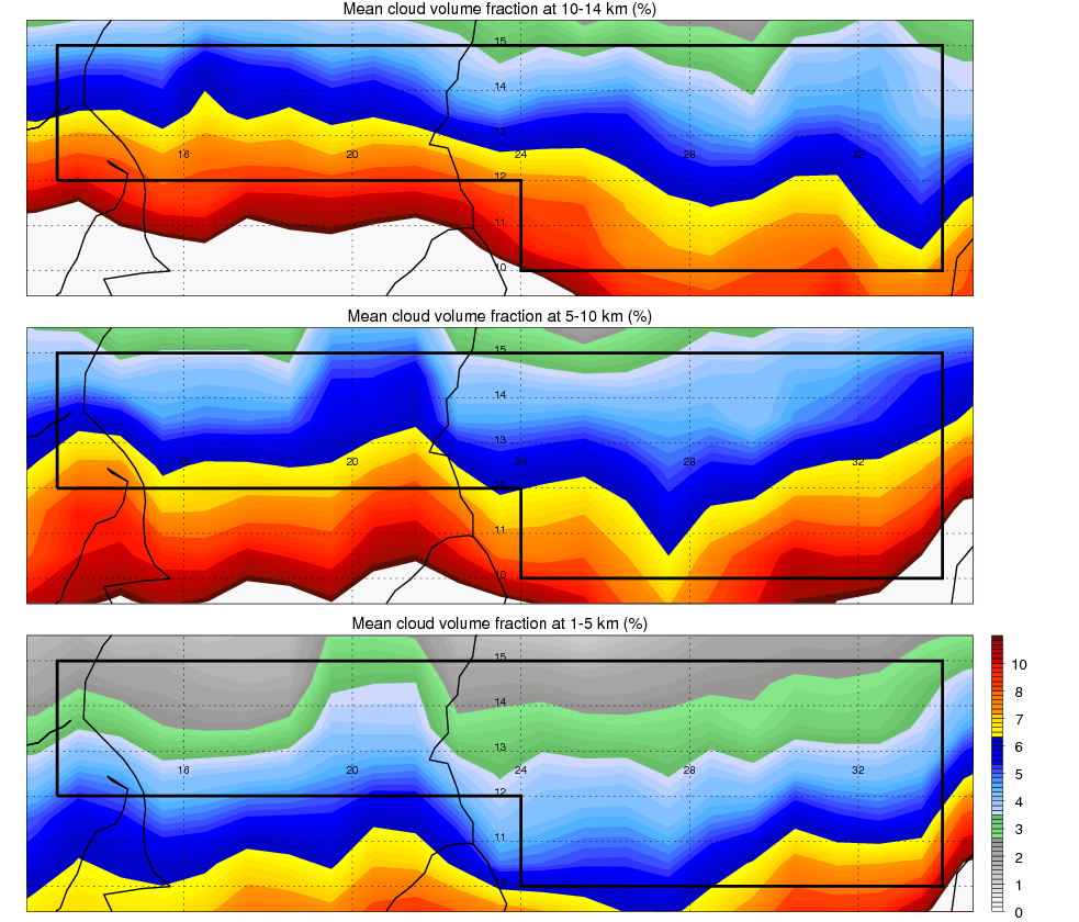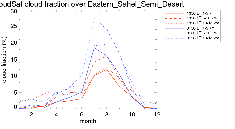 Over Eastern_Sahel_Semi_Desert , mean high level (10-14 km) cloud volume fraction is about 6.8%. Mean mid level (5-10 km) cloud volume fraction is about 6.6%. Mean low level (1-5 km) cloud volume fraction is about 4.4%. Seasonal and day vs. night variations of high, mid and low level cloud fraction over Eastern_Sahel_Semi_Desert are shown in following figure. You may check the details of cloud fraction in various seasons and at different local times. |