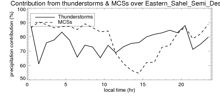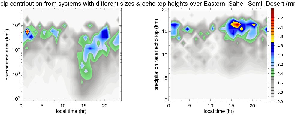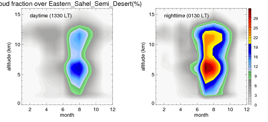 Many studies suggested that the diurnal variation of the precipitation is related to the life cycles of the precipitation systems, which is frequently driven by the surface sensible heating. Over Eastern_Sahel_Semi_Desert, mean annual precipitation are estimated with 424.7 (mm/year) from precipitation radar. Detailed diurnal variation of the precipitation at high resolution can be accessed here (NOTE: it may take long time to generate for a large area). The diurnal variation of precipitation from systems with different sizes and heights are shown below: In total, thunderstorms (systems with detected lightning flashes) contribute 77 %, MCSs (Mesoscale convective systems with raining area > 2000 km^2) contribute 76 % of all precipitation over Eastern_Sahel_Semi_Desert. Diurnal variations of fraction of precipitation from thunderstorms and MCSs over Eastern_Sahel_Semi_Desert are shown below: Certainly there is a strong diurnal variation of different types of clouds. Because CloudSat observes at 0130 and 1330 local time, here the daytime and night cloud fraction in different seasons are presented: |