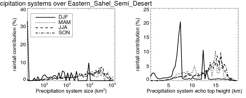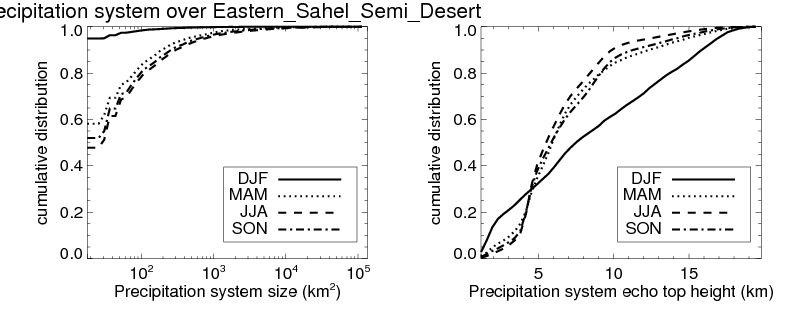 Over Eastern_Sahel_Semi_Desert , mean size of precipitation system about 328.3 (km^2) and mean maximum radar echo top height of these precipitation systems is about 6.9 km. Following figure shows the cumulative distribution of the sizes and depths of the precipitation systems in different seasons: Though usually there are more small systems, the larger systems would bring more total precipitation. |