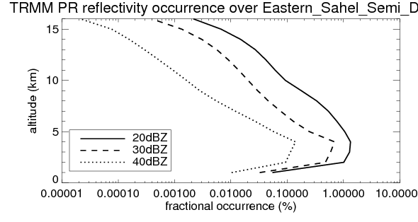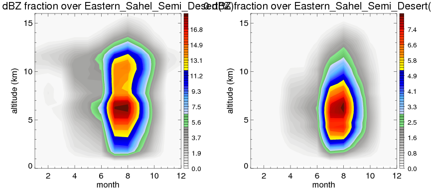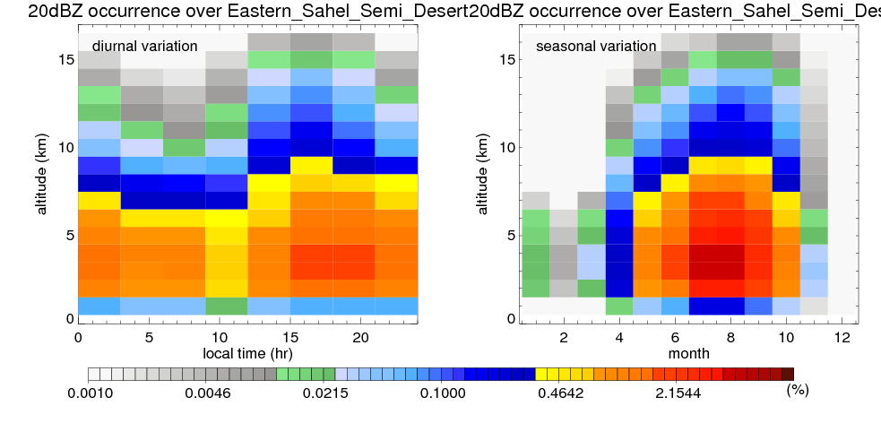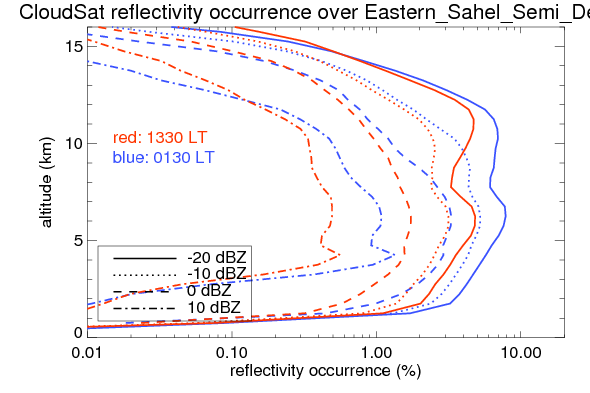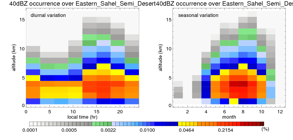 Here the precipitation means the precipitable hydrometeors (raindrops, snow flakes, graupel and hails) that detected by TRMM precipitation radar. Following figure shows the vertical profiles of 20, 30 and 40 dBZ fractional occurrence over Eastern_Sahel_Semi_Desert in different seasons. The seasonal and diurnal variations of precipitation (20 dBZ) fractional occurrence at different altitudes are shown below: The seasonal and diurnal variations of INTENSIVE precipitation (40 dBZ) fractional occurrence at different altitudes are shown below: Clouds are consisted of small hydrometeors that undetectable by TRMM precipitation radar (Ku band). CloudSat (W band radar) provides the much great details of clouds. Following figure shows the vertical structure of the thin and thick clouds over Eastern_Sahel_Semi_Desert. Note that high reflectivity at low levels are less frequent due to the attenuation. The seasonal variation of thin (-20 dBZ) and thick (0 dBZ) cloud over Eastern_Sahel_Semi_Desert are shown below: |