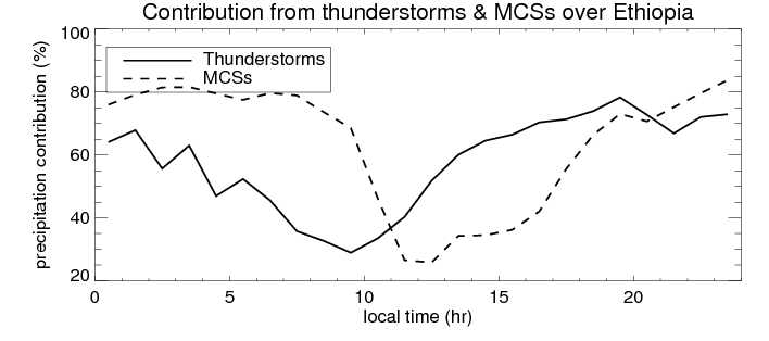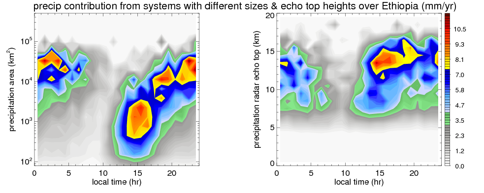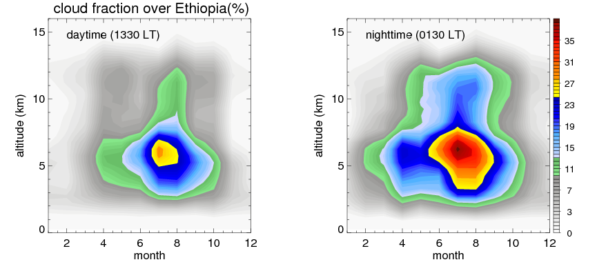 Many studies suggested that the diurnal variation of the precipitation is related to the life cycles of the precipitation systems, which is frequently driven by the surface sensible heating. Over Ethiopia, mean annual precipitation are estimated with 1114.4 (mm/year) from precipitation radar. Detailed diurnal variation of the precipitation at high resolution can be accessed here (NOTE: it may take long time to generate for a large area). The diurnal variation of precipitation from systems with different sizes and heights are shown below: In total, thunderstorms (systems with detected lightning flashes) contribute 62 %, MCSs (Mesoscale convective systems with raining area > 2000 km^2) contribute 62 % of all precipitation over Ethiopia. Diurnal variations of fraction of precipitation from thunderstorms and MCSs over Ethiopia are shown below: Certainly there is a strong diurnal variation of different types of clouds. Because CloudSat observes at 0130 and 1330 local time, here the daytime and night cloud fraction in different seasons are presented: |
